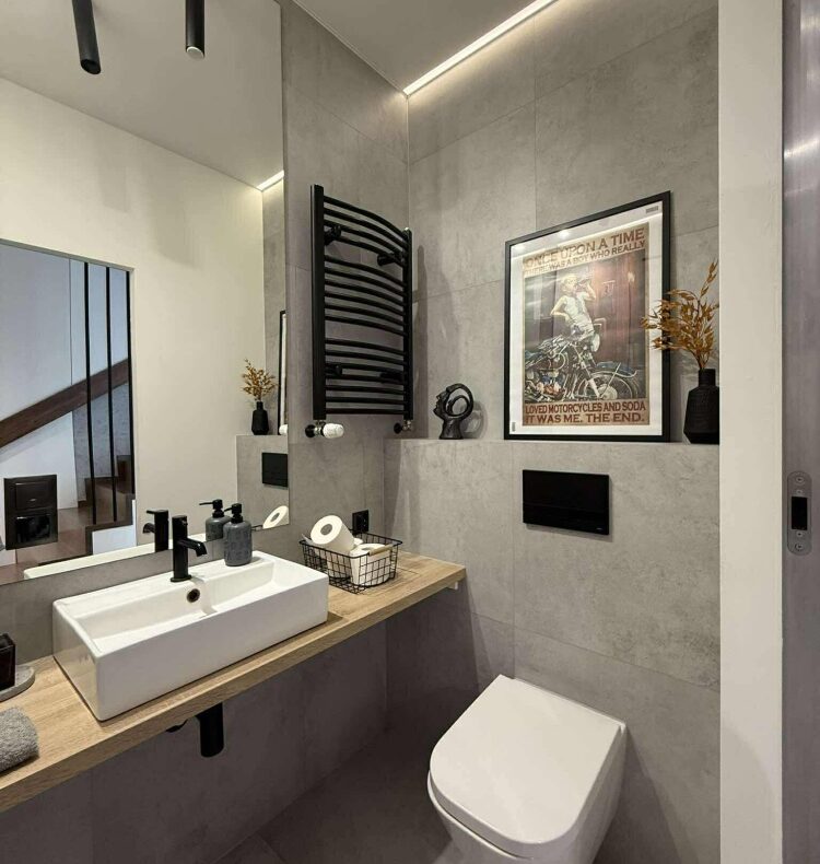 – na parterze znajduje się przestronny salon z kominkiem, półotwartą kuchnią oraz wyjściem na taras i ogród, a także toaleta.