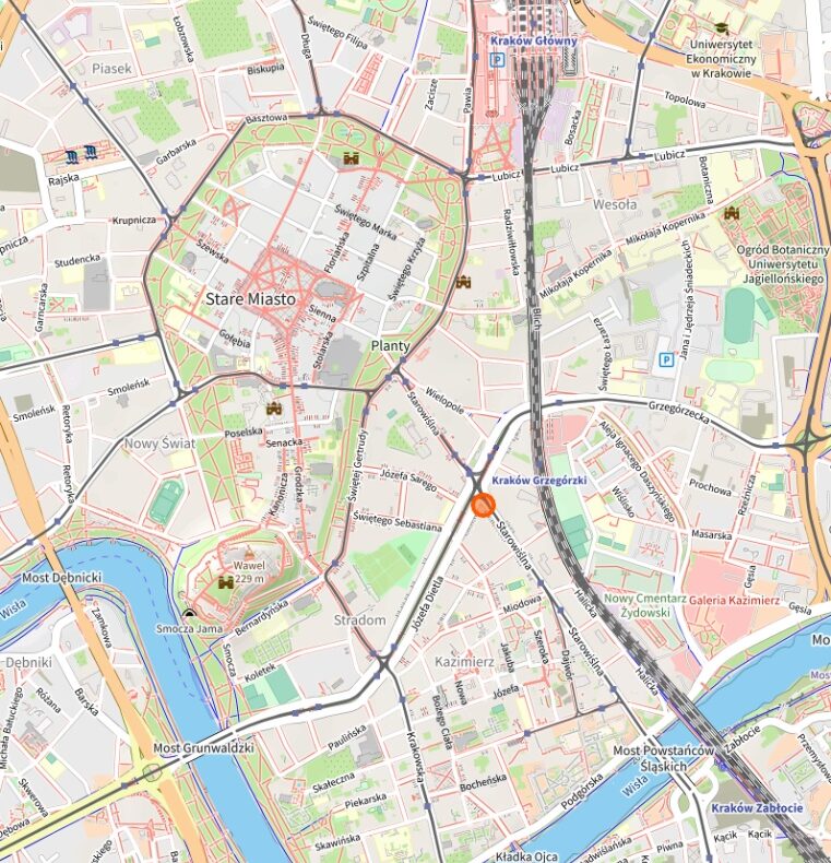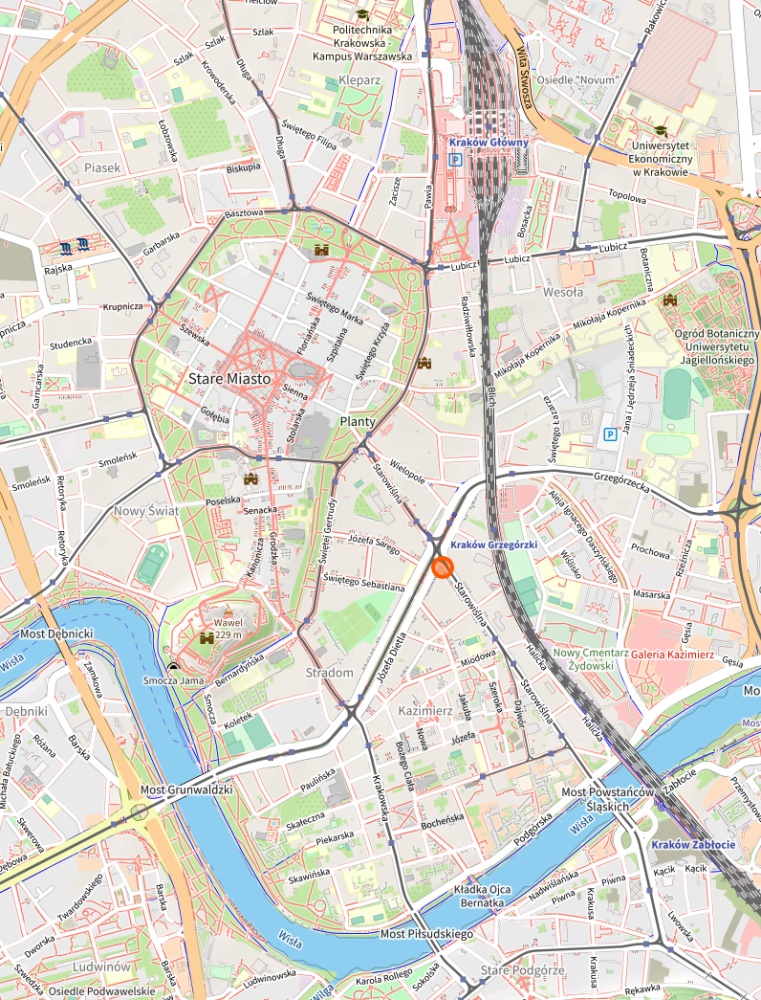 Ścisłe centrum Krakowa, między Rynkiem Głównym a Kazimierzem