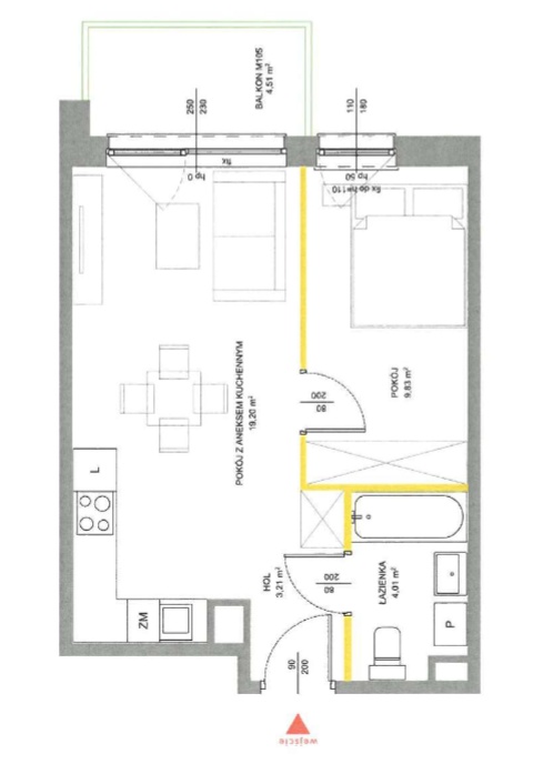 Mieszkanie posiada bardzo praktyczny rozkład – w salonie okno na całą ścianę idealnie doświetla i optycznie powiększa pomieszczenie. W sypialni zmieścimy duże, podwójne łóżko oraz szafę na całą szerokość pokoju. Aneks kuchenny w kształcie litery L zapewni wystarczający blat roboczy i sporo miejsca do przechowywania. Całość pozwoli na komfortowe użytkowanie zarówno przez singla, parę, jak i jako inwestycja pod wynajem.