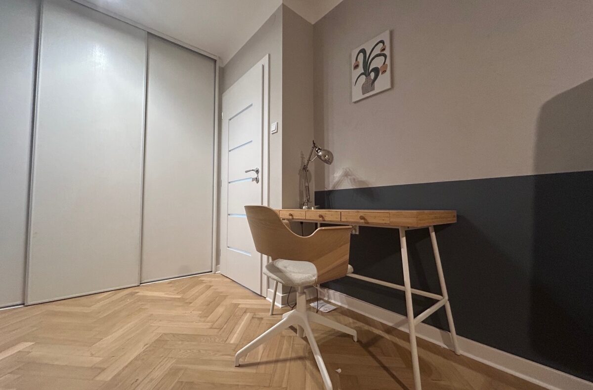 Sypialnia – z podwójnym łóżkiem i biurkiem do pracy.
