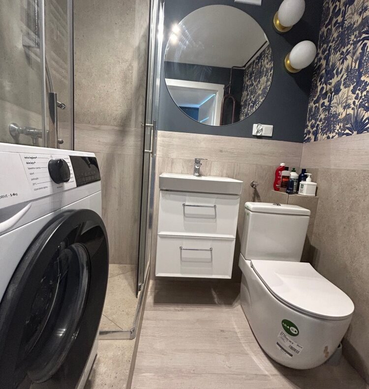 Łazienka – z kabiną prysznicową oraz pralką.