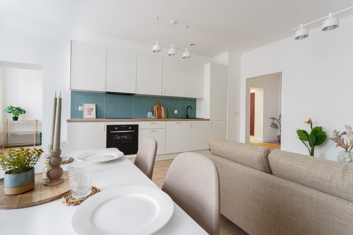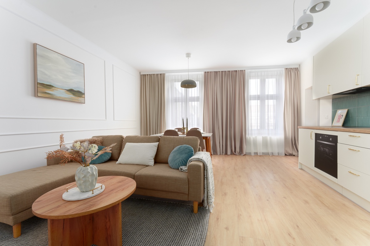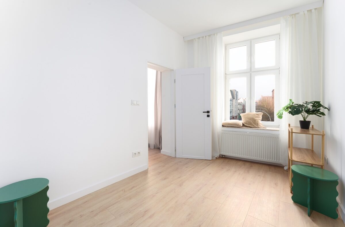 To mieszkanie jest idealnym połączeniem klimatu kamienicy i nowoczesnego wykończenia. Zachwyca już od wejścia: wysokie sufity, duże okna oraz elegancka sztukateria nadają wnętrzu ponadczasowy charakter, przestrzeń i światło. Całość została przygotowana w spójnym stylu, z dbałością o detale i funkcjonalność — bez przypadkowych rozwiązań.
