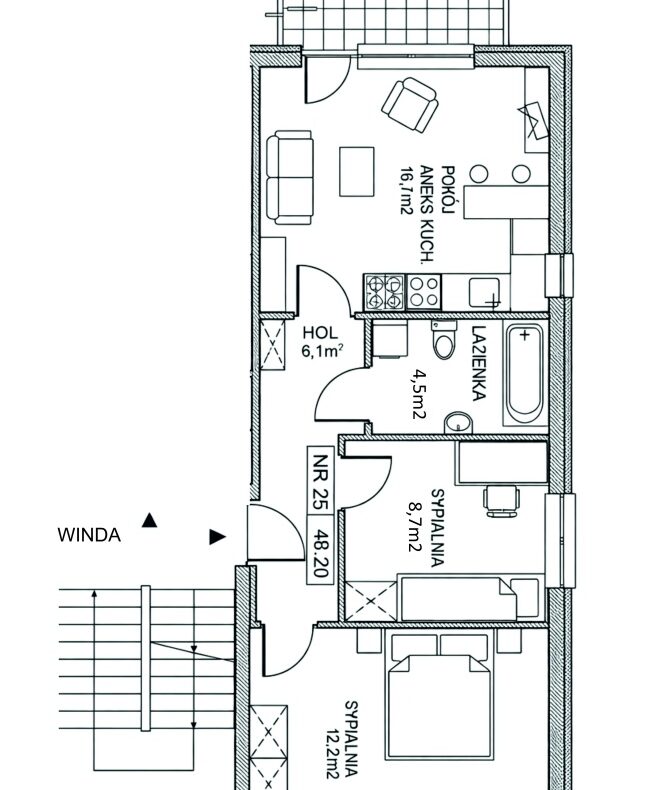 Przemyślany rozkład pomieszczeń zapewnia wygodę na co dzień. Dwie sypialnie tworzą prywatną strefę, a salon z aneksem kuchennym staje się sercem domu do wspólnego gotowania, spotkań z bliskimi i odpoczynku po pracy. Budynek dobrze izoluje od hałasu ulic, dzięki czemu można cieszyć się ciszą i spokojnym sąsiedztwem.