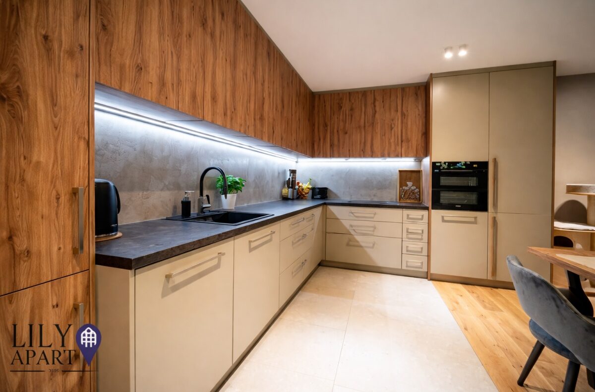 To otwarta przestrzeń w pełni wyposażona we wszystkie urządzenia niezbędne do komfortowego mieszkania. Kuchnia jest połączona z częścią jadalną i dalej z salonem. Meble, które znajdują się w kuchni, zostały przygotowane przez stolarza. Bardzo duża ilość szafek i szuflad. Każda dostępna przestrzeń została wykorzystana do maksimum.