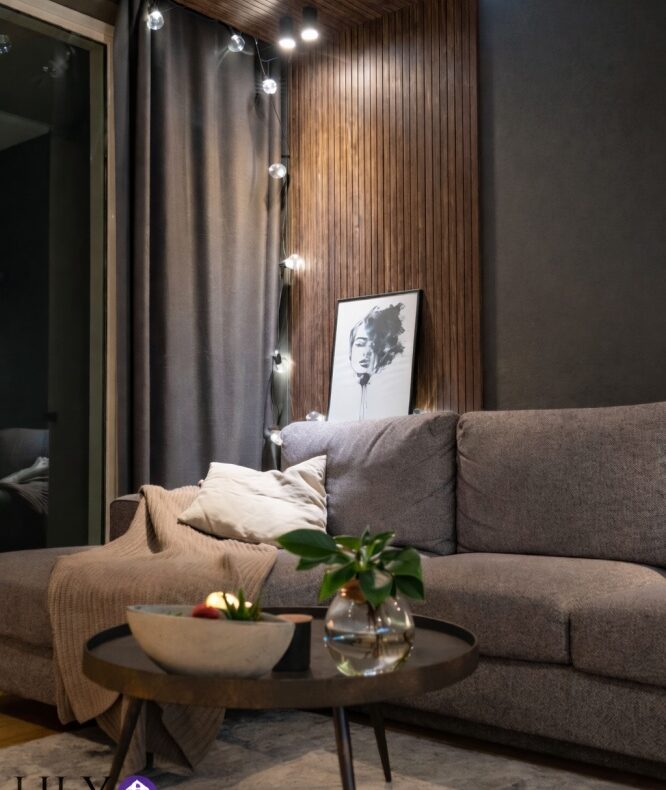 Sercem salonu jest narożna kanapa, z możliwością rozłożenia, co służyć może jako dodatkowa przestrzeń do relaksu lub miejsce do spania.