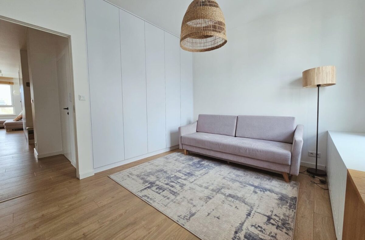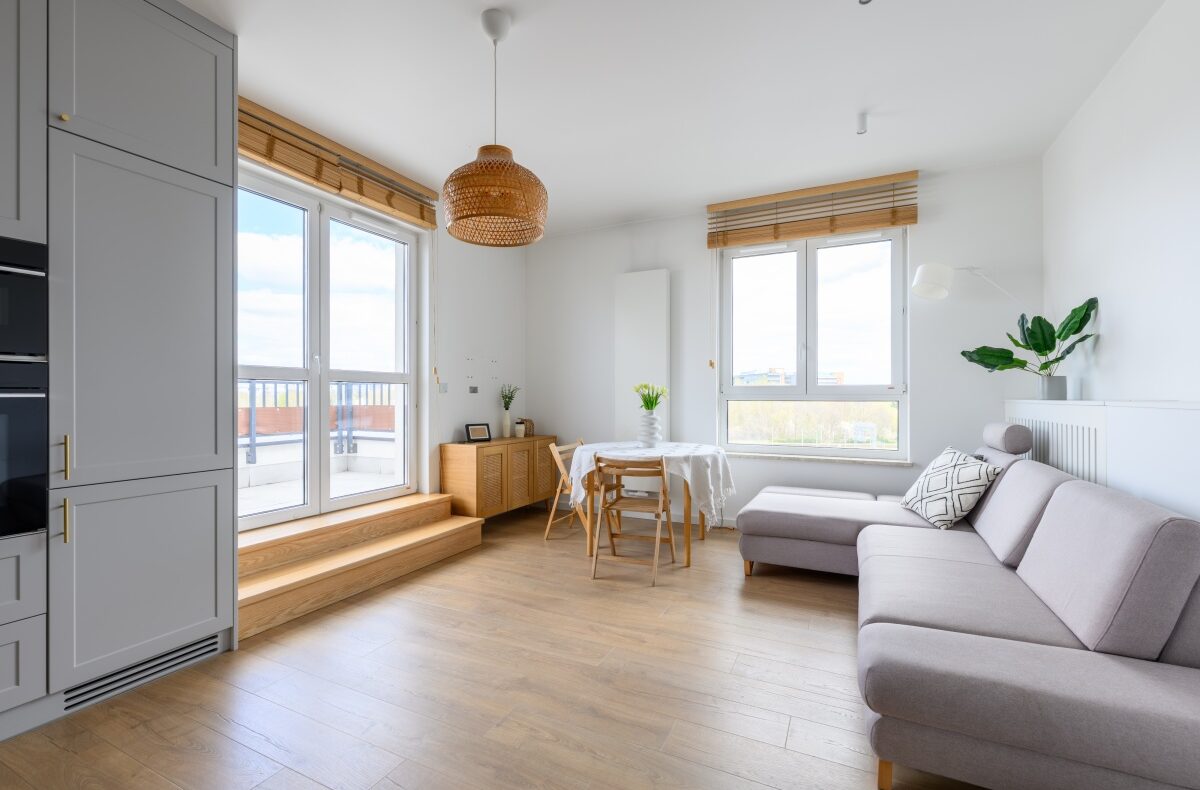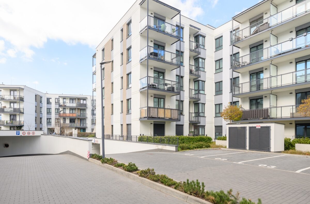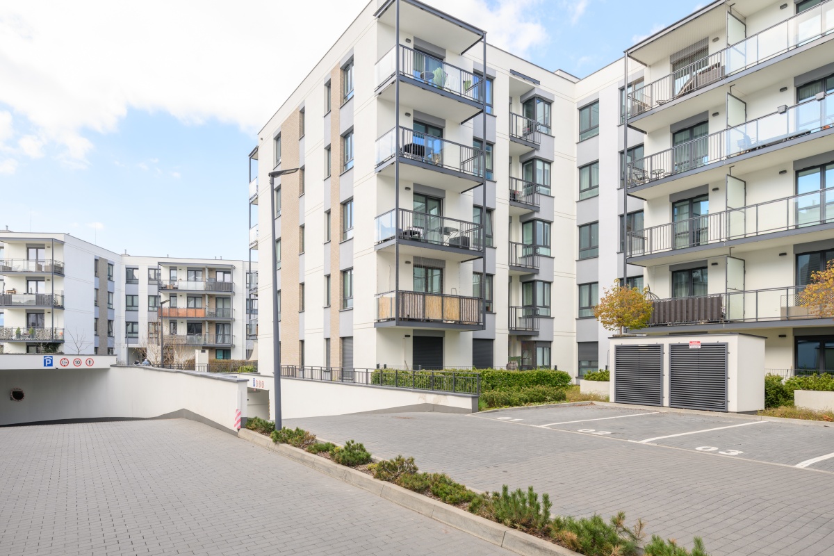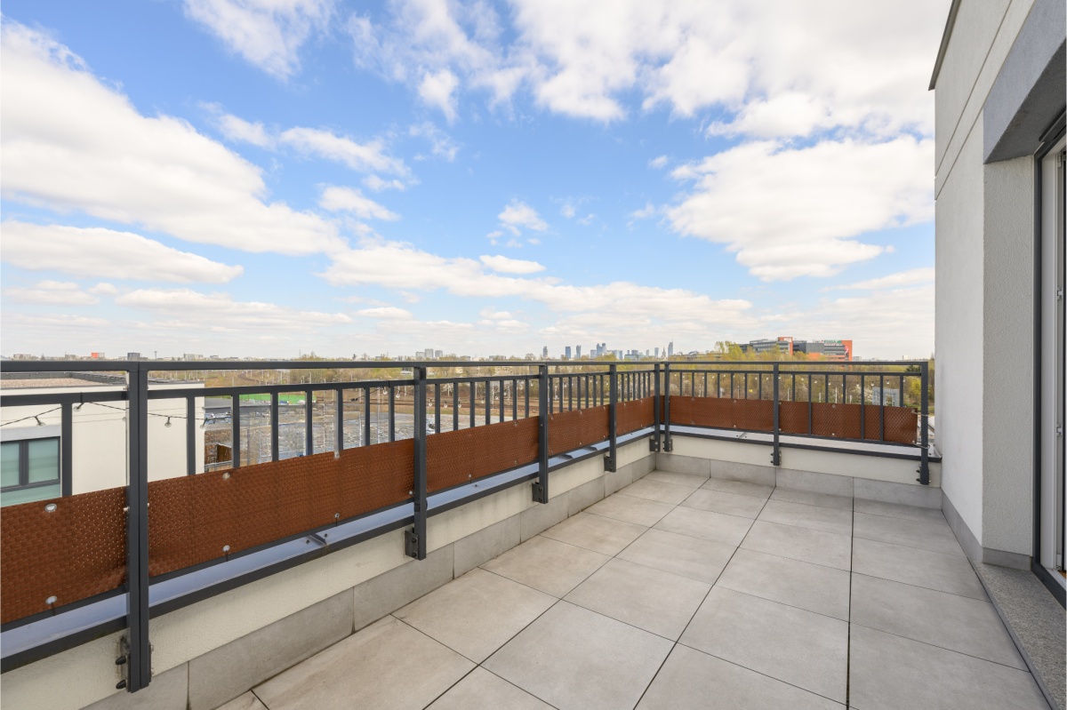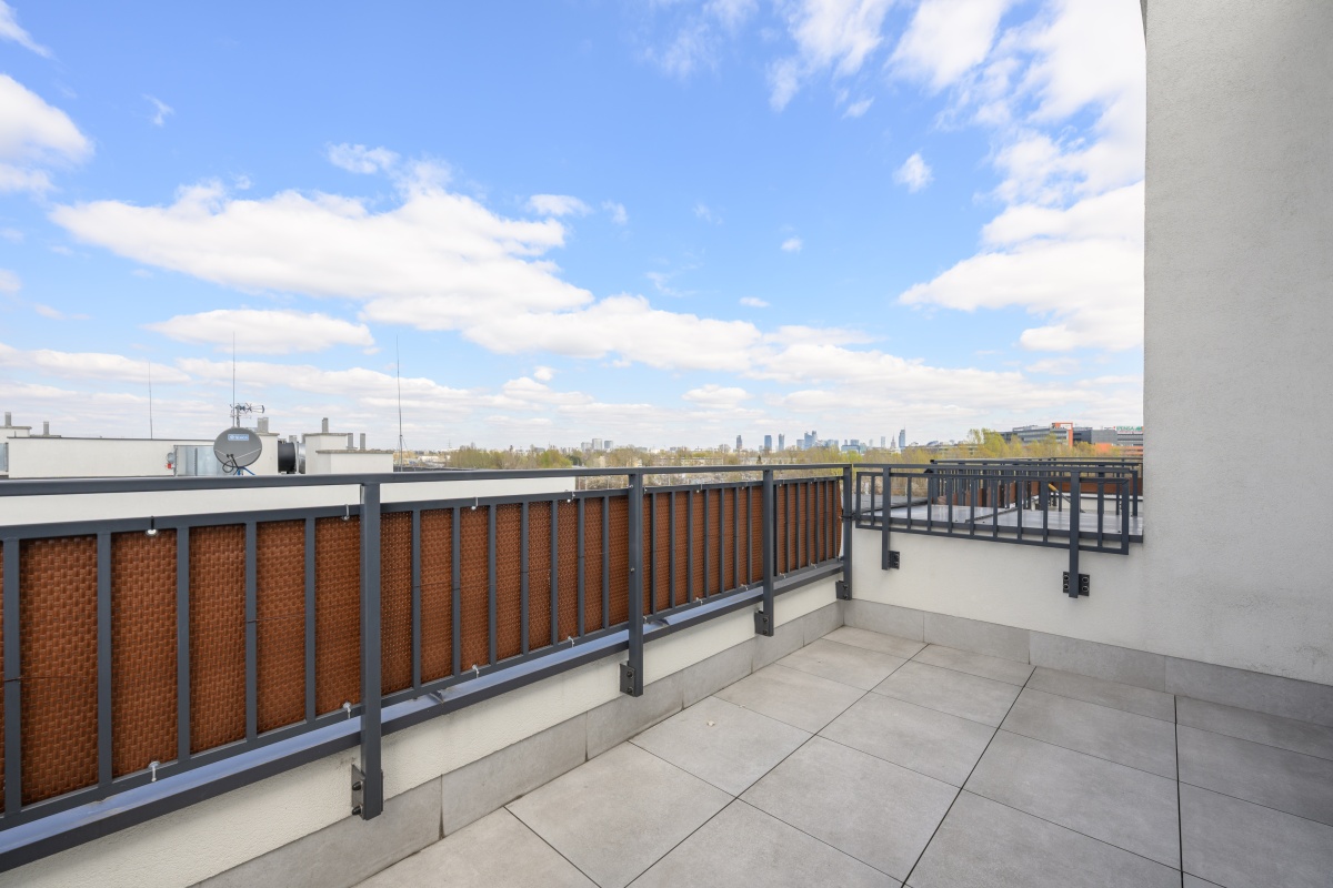 Gwarantowana panorama: 5. piętro z widokiem na centrum Warszawy. Układ okolicy daje pewność, że widok nigdy nie zostanie zasłonięty.