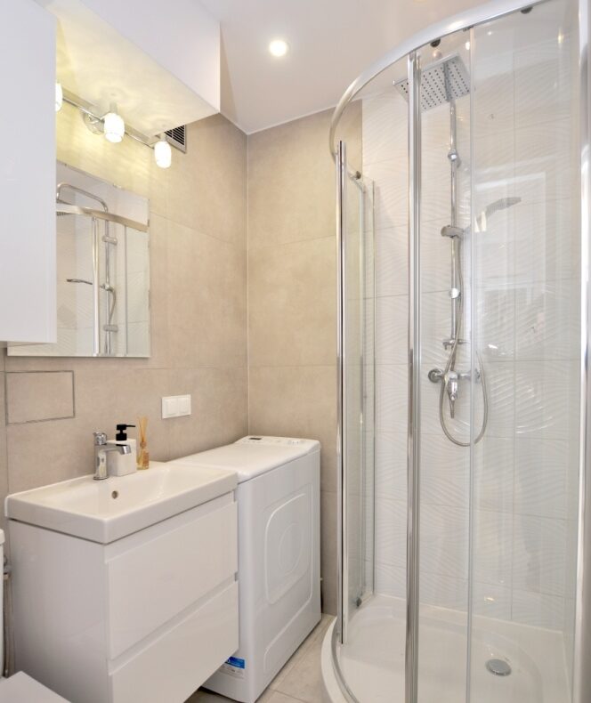 – Łazienka – kabina prysznicowa z deszczownicą, elegancka armatura, pralka, zabudowa meblowa