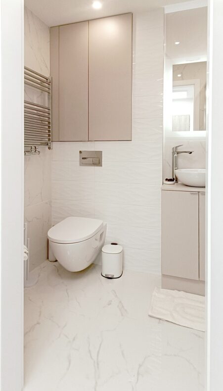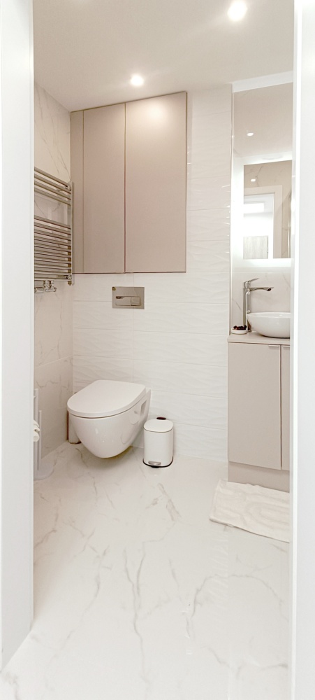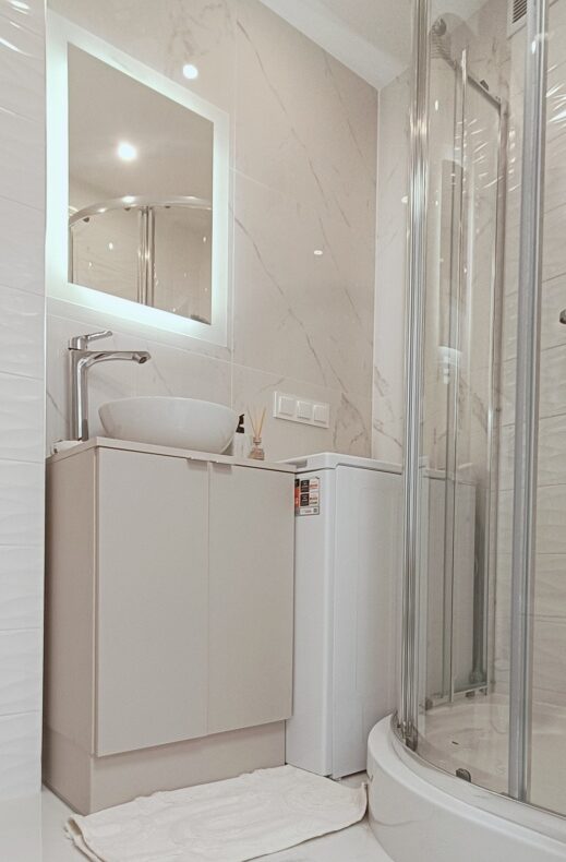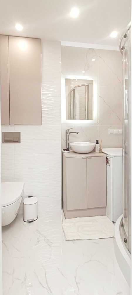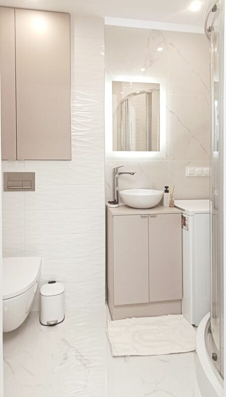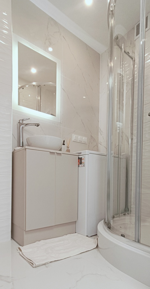– Łazienka – wykończona w eleganckim stylu, z dużym lustrem LED, kabiną prysznicową, podwieszanym WC, szafkami w zabudowie, pralką i efektowną umywalką nablatową