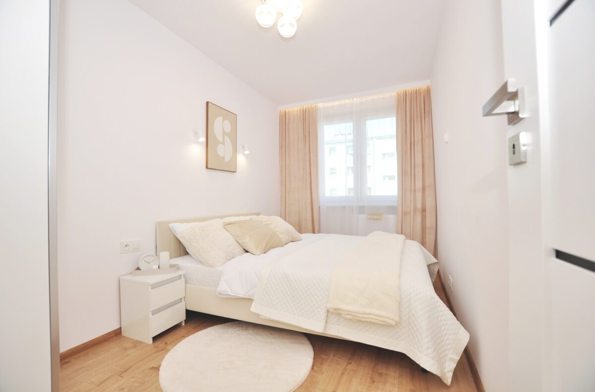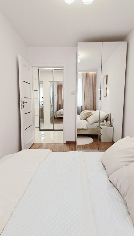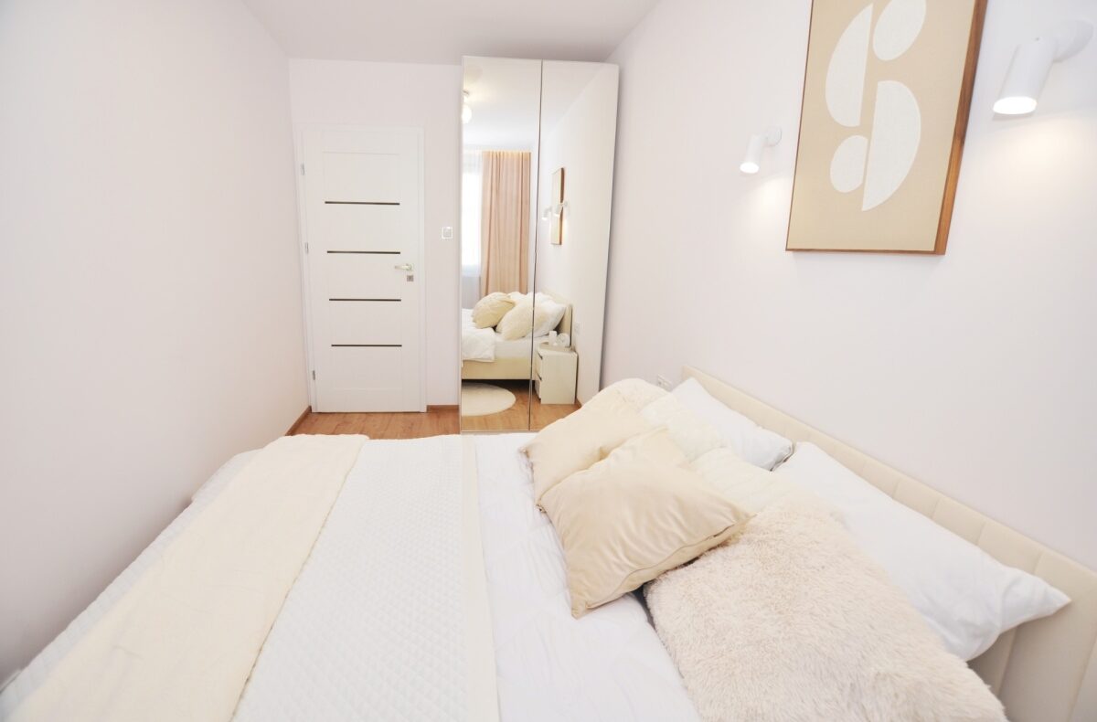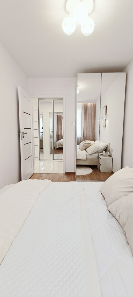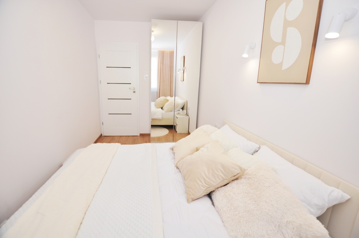 – Sypialnia – przytulna, z dużym łóżkiem małżeńskim, pojemną szafą z lustrami, nowoczesnym oświetleniem i dodatkami tekstylnymi
