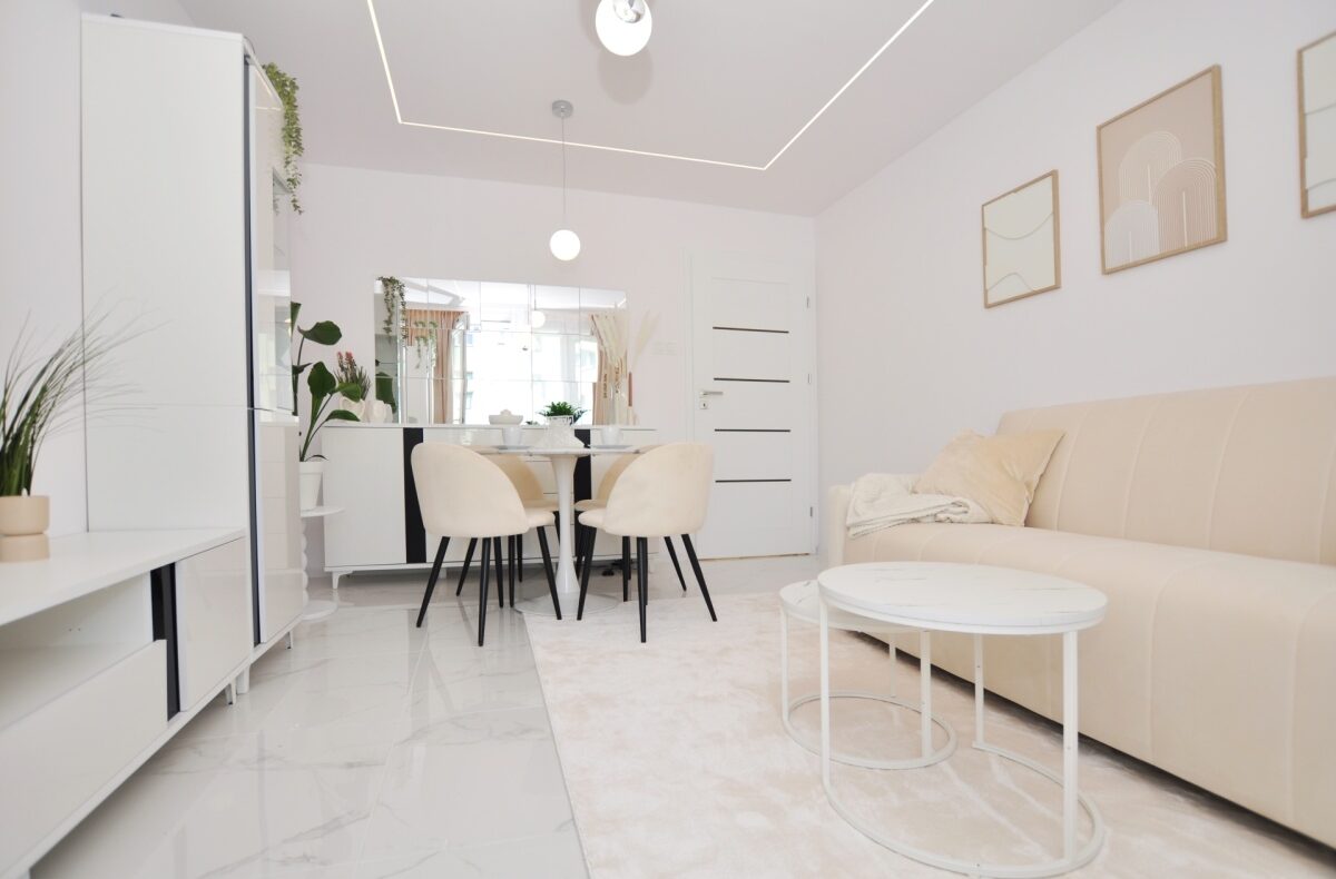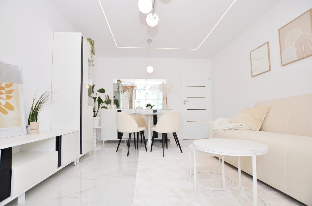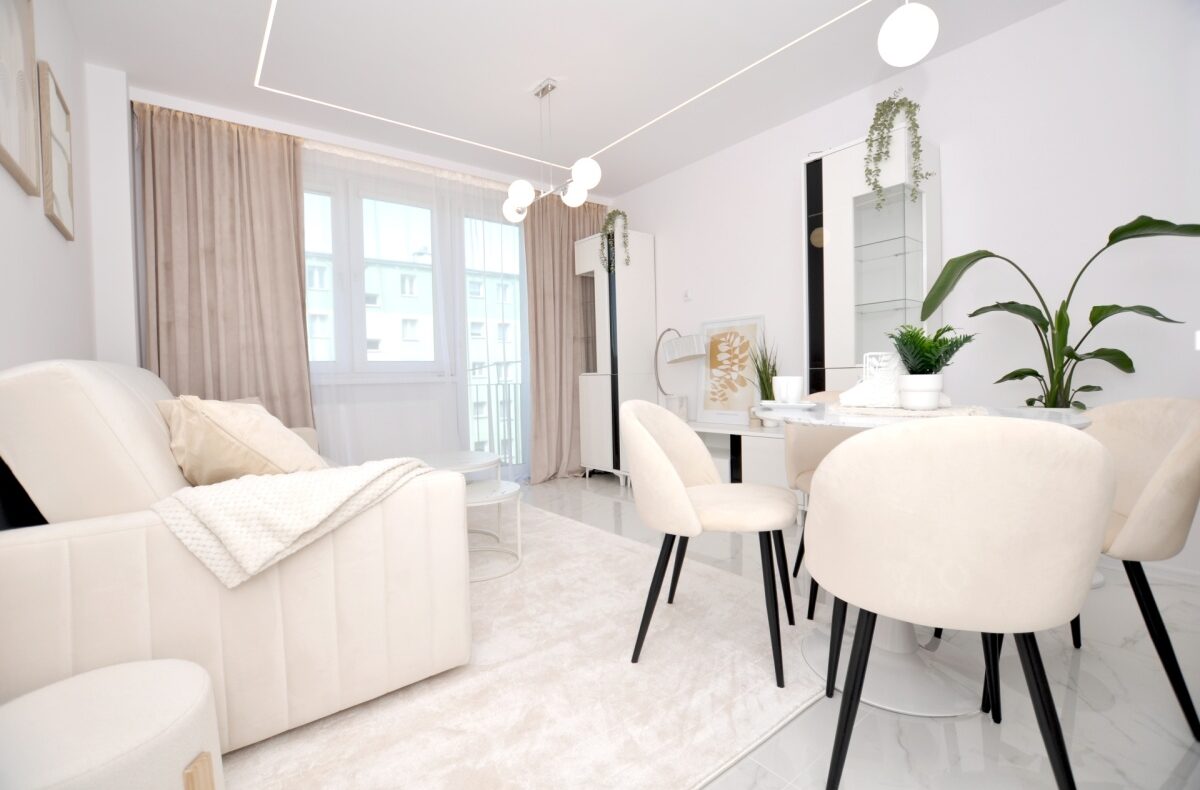 – Salon z balkonem – stylowy, jasny, z designerskim oświetleniem LED, rozkładaną sofą, stolikiem kawowym, stołem jadalnym i wyjściem na balkon