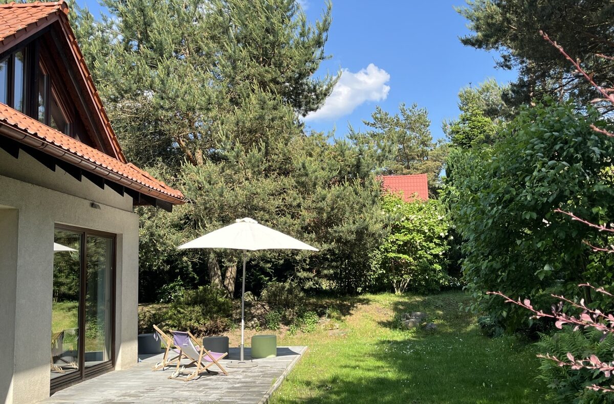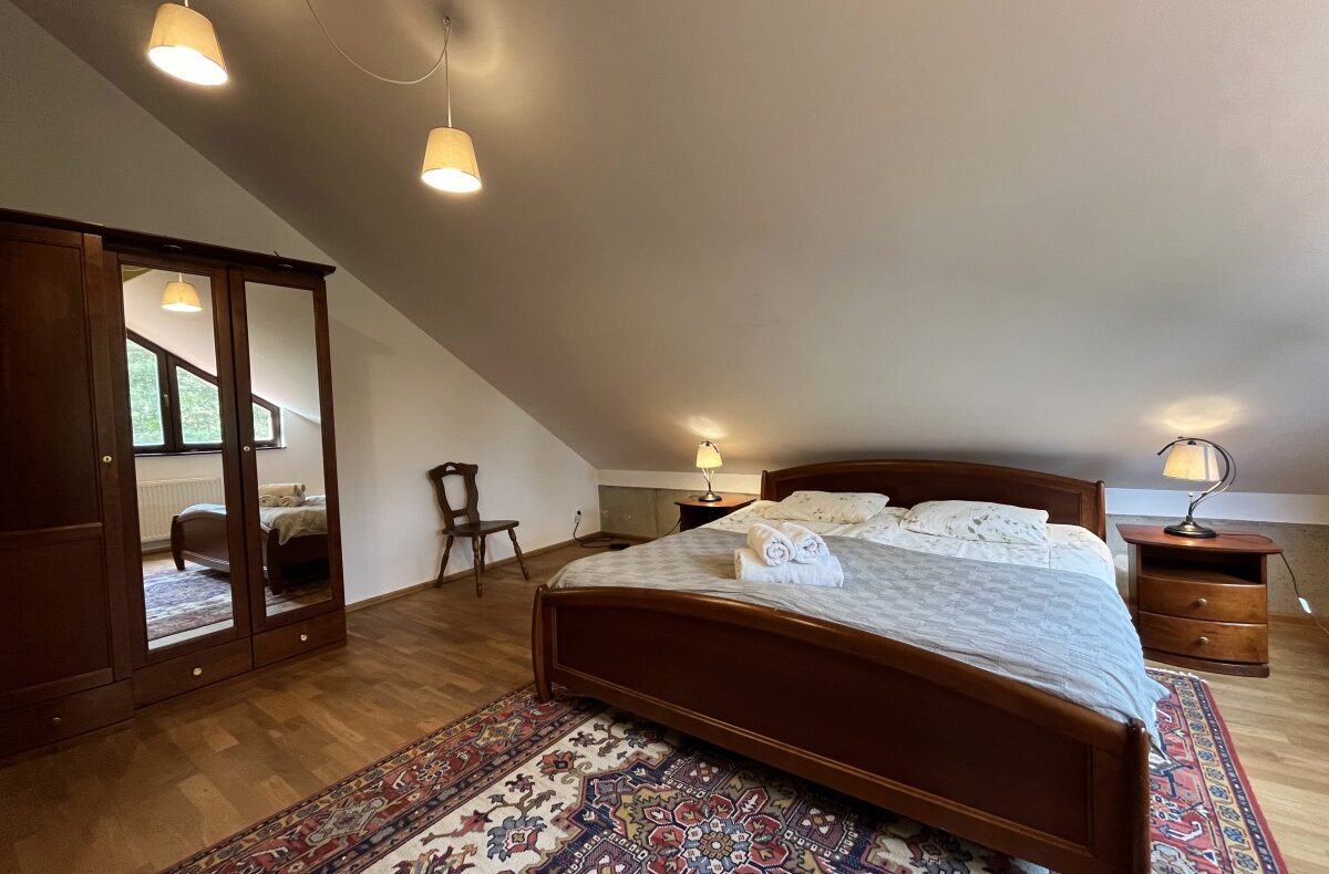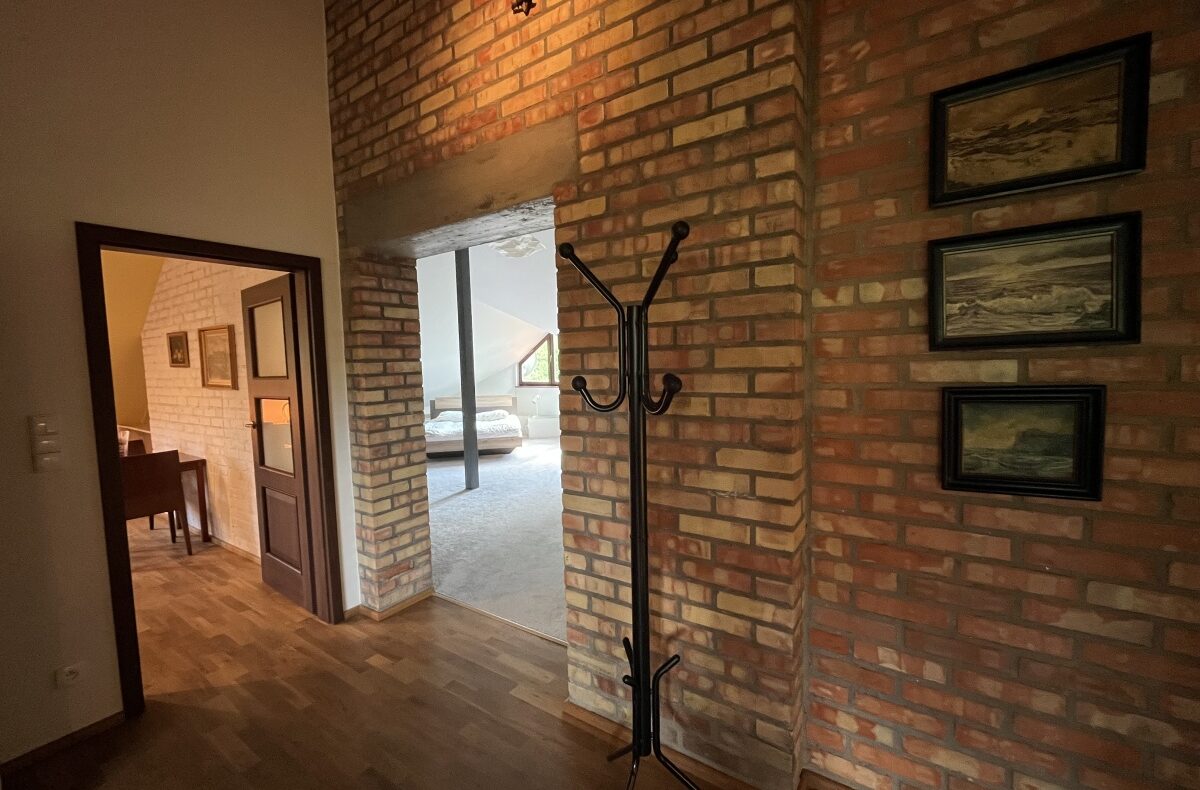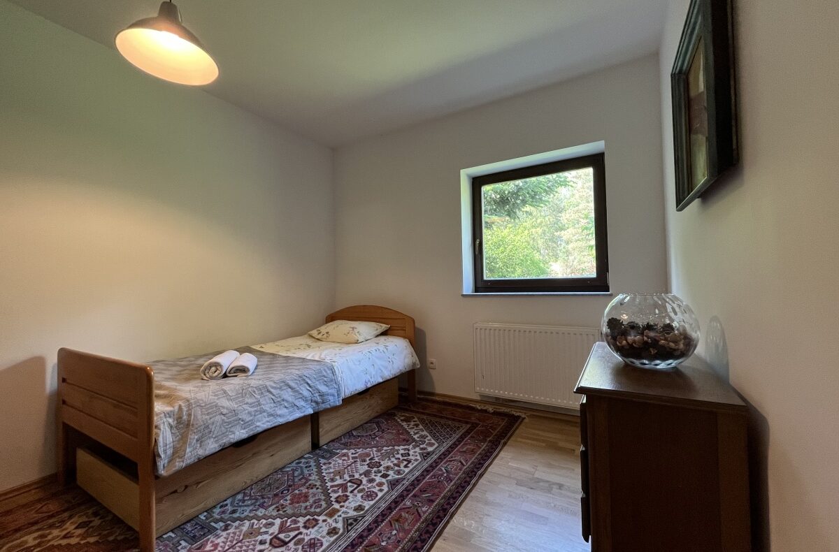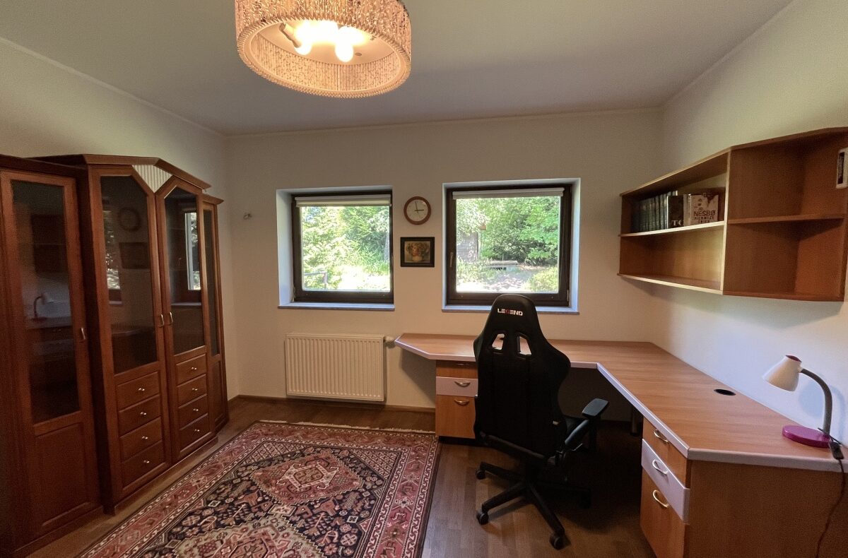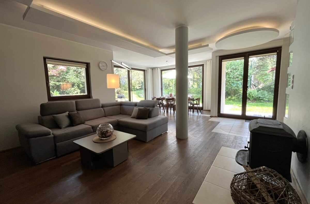 Dom o klimatycznym wnętrzu, widok z okien na cztery strony świata. Jasne pomieszczenia, nasłonecznione, w każdym pokoju widok na zieleń. Okna drewniane wysokiej jakości, na podłogach parkiet dębowy, panele w 2 małych sypialniach i wysokiej jakości glazura i terakota. Ściany o jasnej kolorystyce, wszystkie łazienki oraz część kuchenna w glazurze i terakocie. Kuchnia o pełnym wyposażeniu – okap, kuchenka, zmywarka, piekarnik, ekspres do kawy, zabudowa kuchenna wysokiej jakości. Teren ogrodzony, dojazd utwardzony.