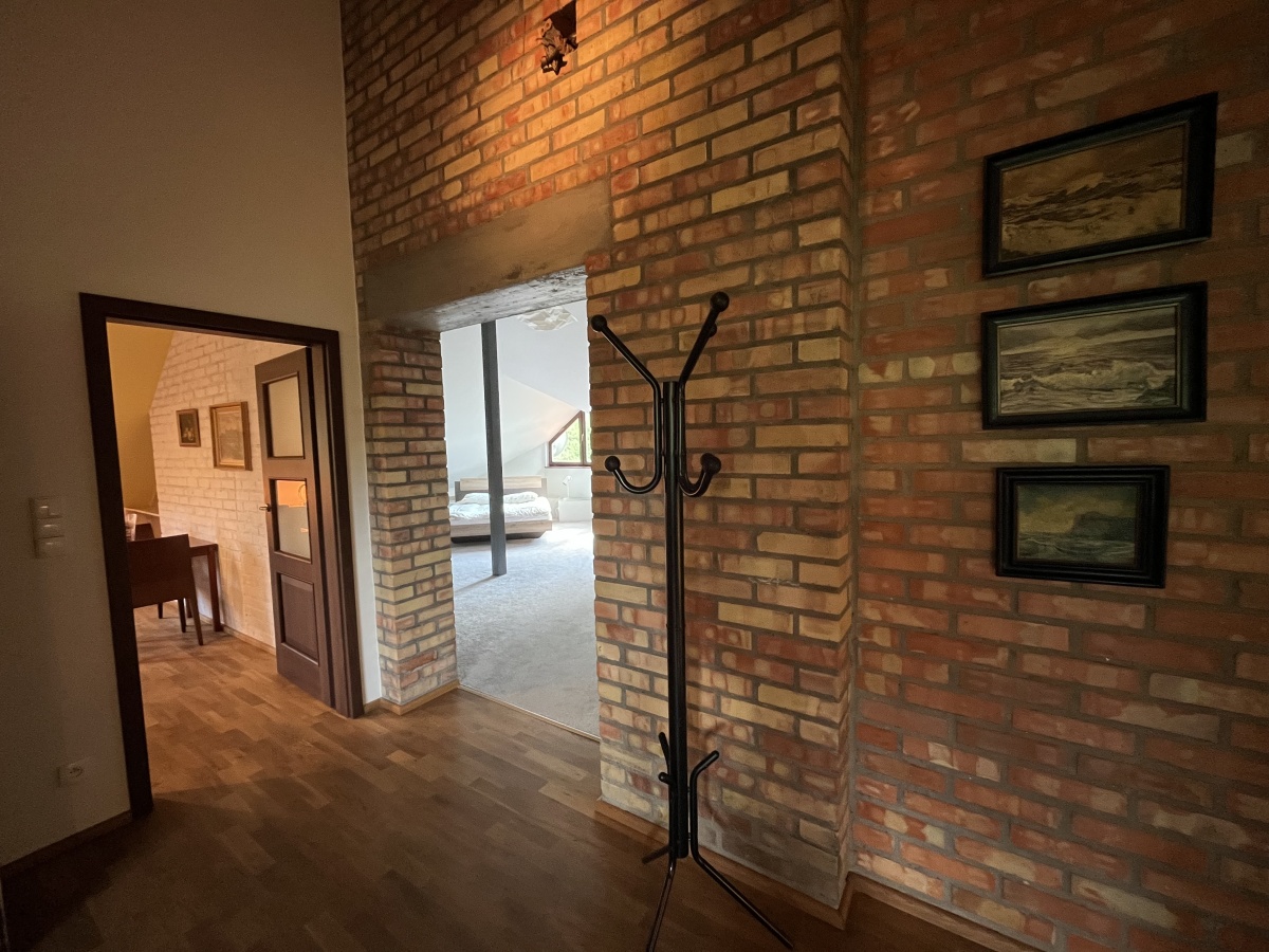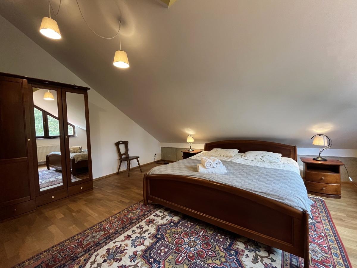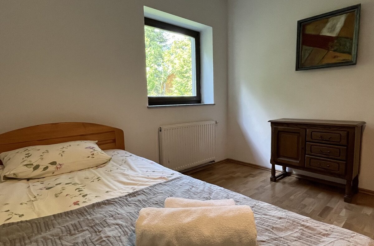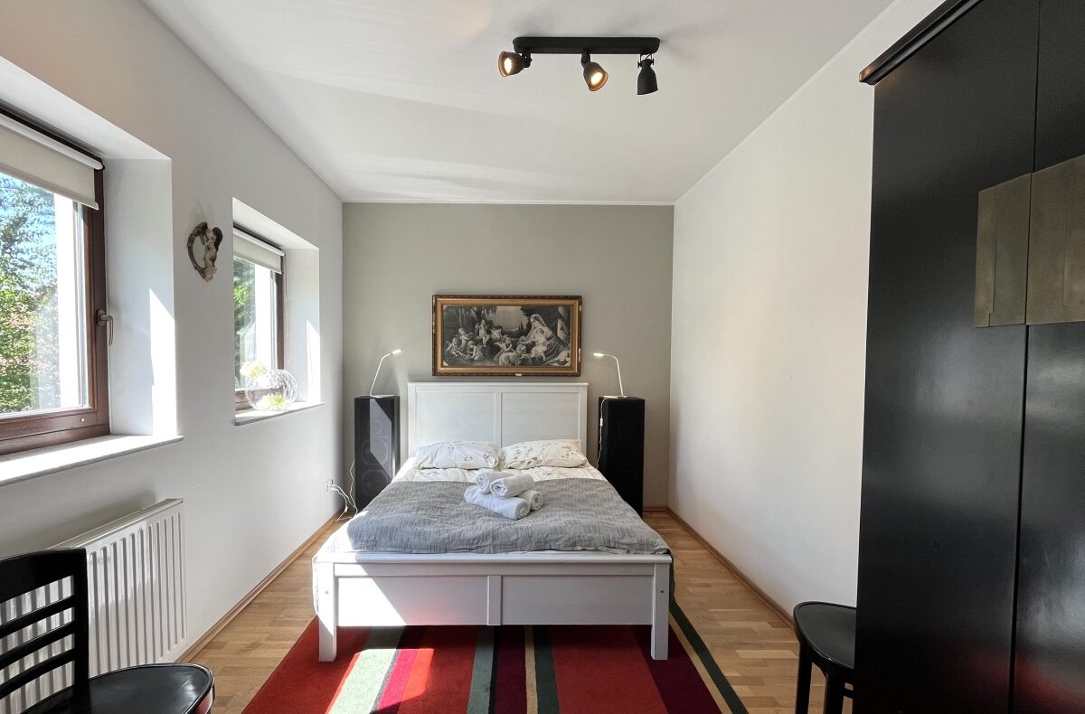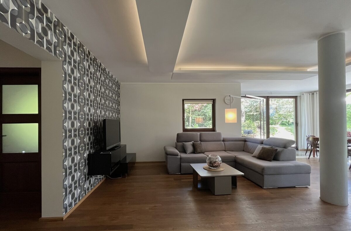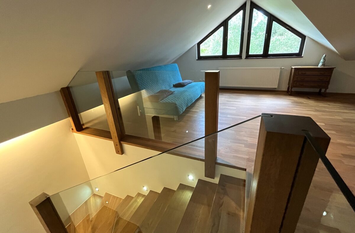 Dom o klimatycznym wnętrzu, widok z okien na cztery strony świata. Jasne pomieszczenia, nasłonecznione, w każdym pokoju widok na zieleń. Okna drewniane wysokiej jakości, na podłogach parkiet dębowy, panele w 2 małych sypialniach i wysokiej jakości glazura i terakota. Ściany o jasnej kolorystyce, wszystkie łazienki oraz część kuchenna w glazurze i terakocie. Kuchnia o pełnym wyposażeniu – okap, kuchenka, zmywarka, piekarnik, ekspres do kawy, zabudowa kuchenna wysokiej jakości. Teren ogrodzony, dojazd utwardzony.