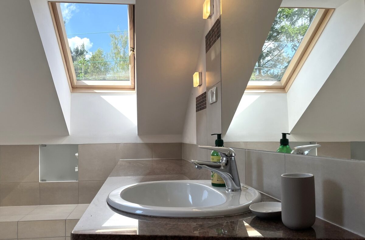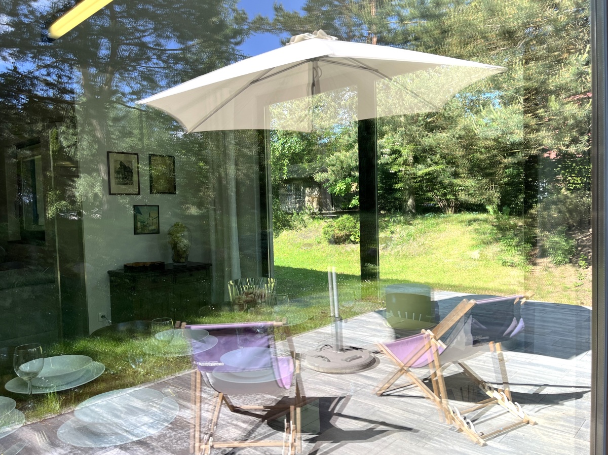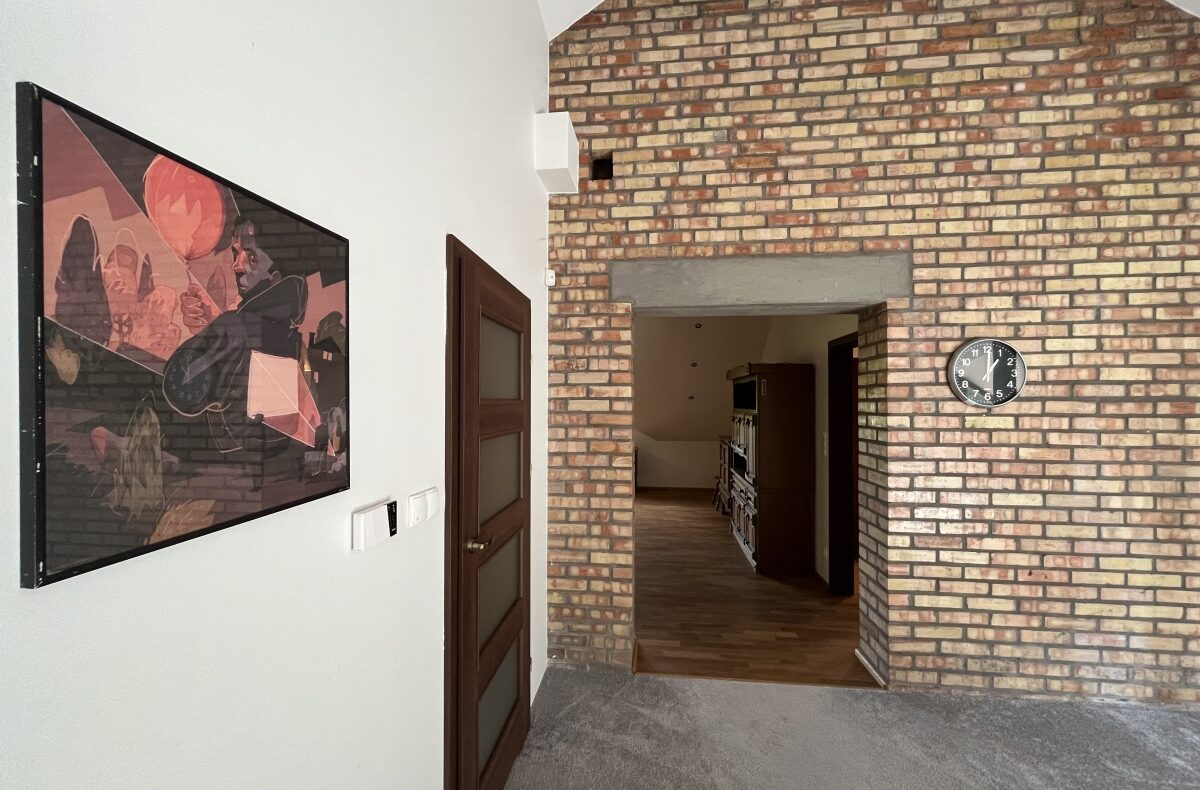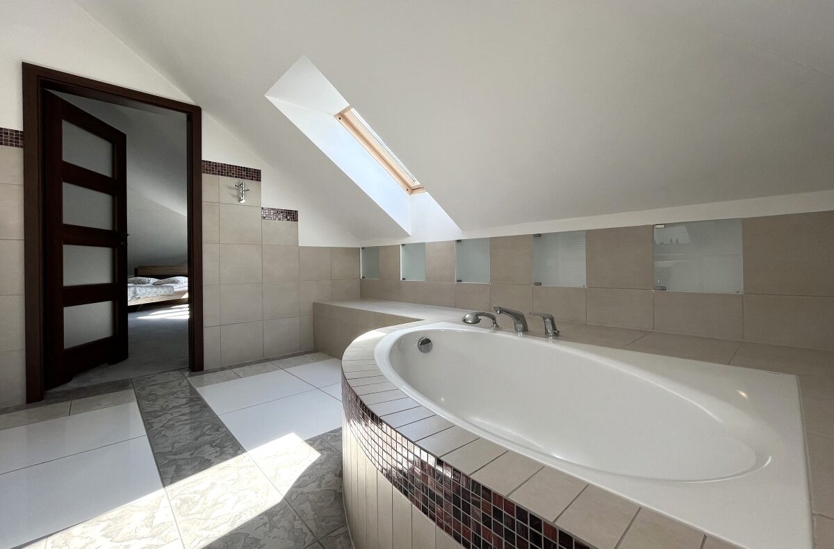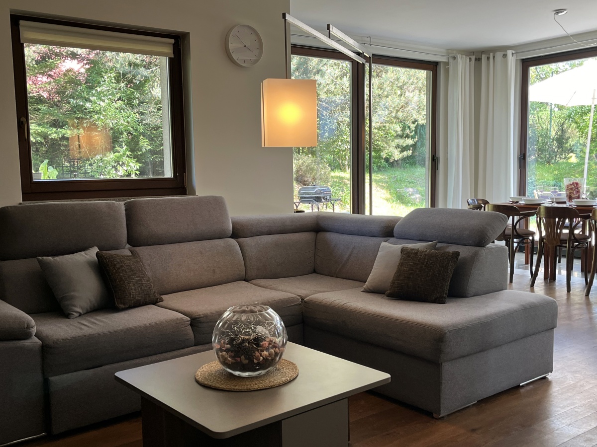 Dom o klimatycznym wnętrzu, widok z okien na cztery strony świata. Jasne pomieszczenia, nasłonecznione, w każdym pokoju widok na zieleń. Okna drewniane wysokiej jakości, na podłogach parkiet dębowy, panele w 2 małych sypialniach i wysokiej jakości glazura i terakota. Ściany o jasnej kolorystyce, wszystkie łazienki oraz część kuchenna w glazurze i terakocie. Kuchnia o pełnym wyposażeniu – okap, kuchenka, zmywarka, piekarnik, ekspres do kawy, zabudowa kuchenna wysokiej jakości. Teren ogrodzony, dojazd utwardzony.