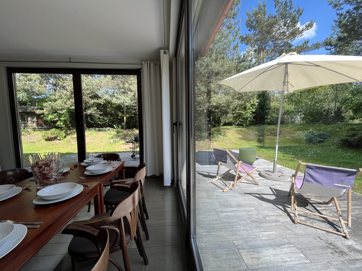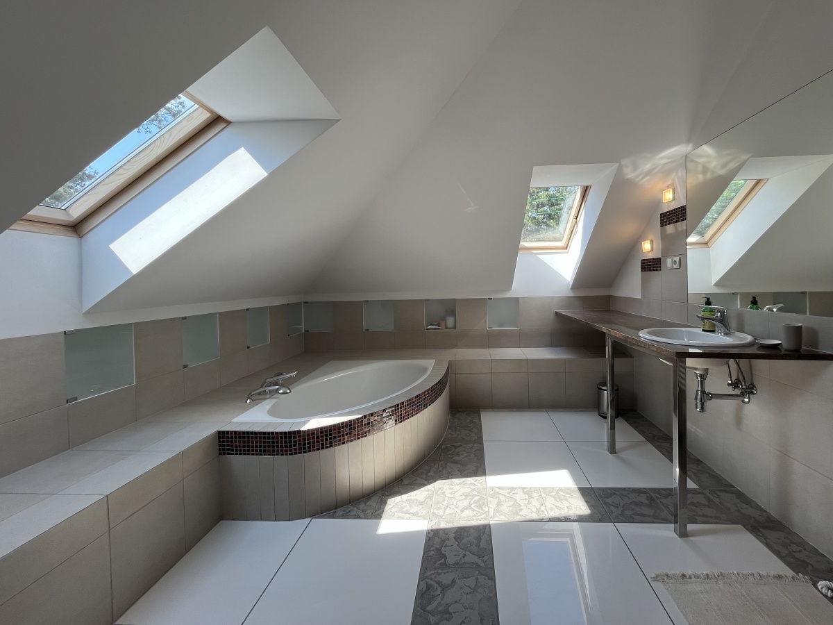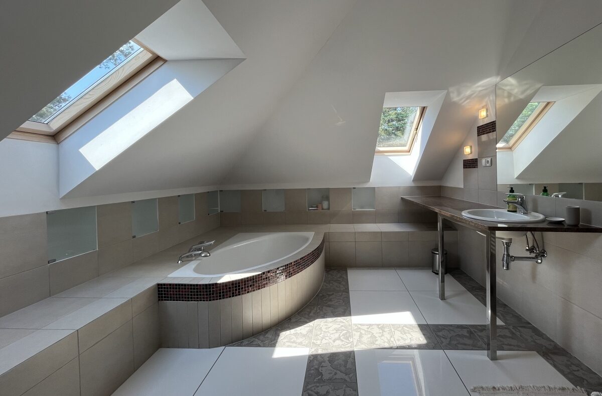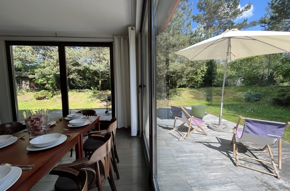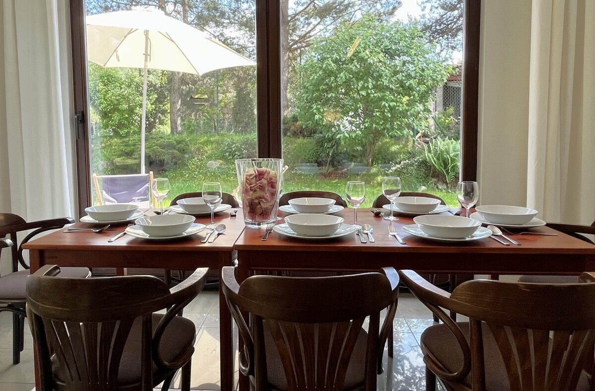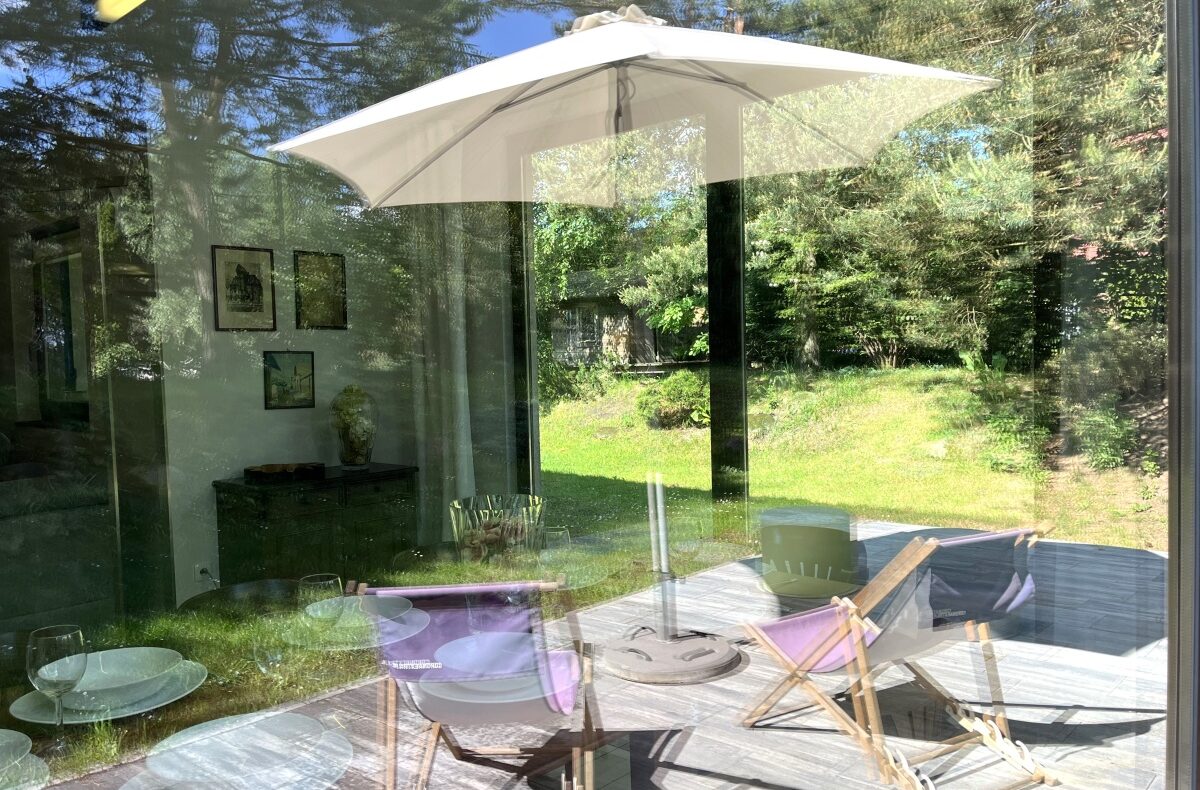 Dom o klimatycznym wnętrzu, widok z okien na cztery strony świata. Jasne pomieszczenia, nasłonecznione, w każdym pokoju widok na zieleń. Okna drewniane wysokiej jakości, na podłogach parkiet dębowy, panele w 2 małych sypialniach i wysokiej jakości glazura i terakota. Ściany o jasnej kolorystyce, wszystkie łazienki oraz część kuchenna w glazurze i terakocie. Kuchnia o pełnym wyposażeniu – okap, kuchenka, zmywarka, piekarnik, ekspres do kawy, zabudowa kuchenna wysokiej jakości. Teren ogrodzony, dojazd utwardzony.