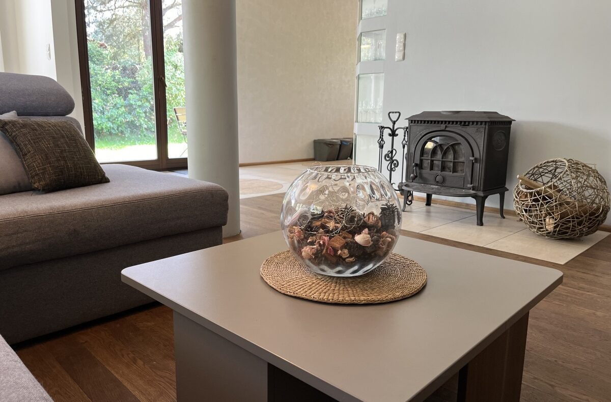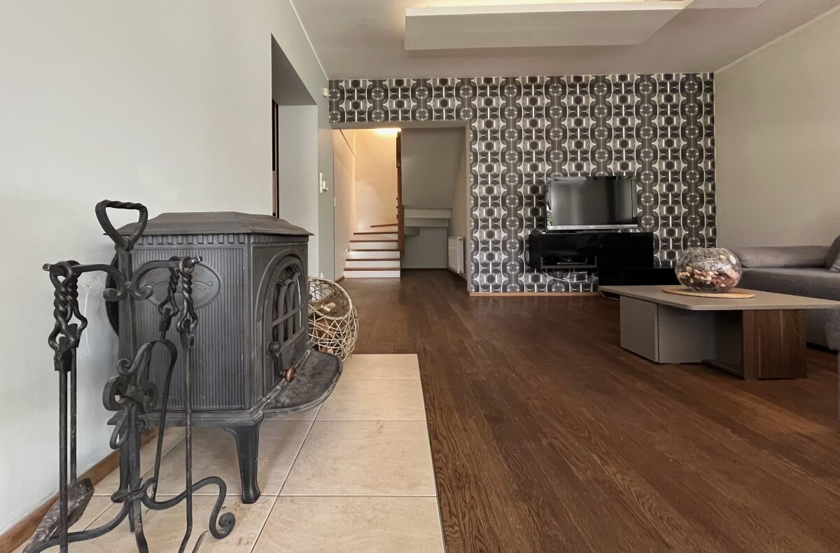 OGRZEWANIE: kuchnia, korytarz, część salonu pokryta kaflami, łazienki i garderoba – ogrzewanie podłogowe, w innych pomieszczeniach grzejniki – ogrzewanie na piec dwu-funkcyjny na gaz + wydajny kominek.