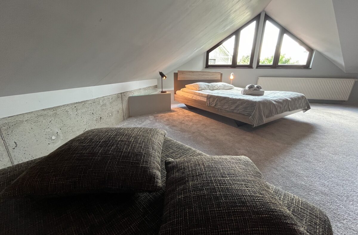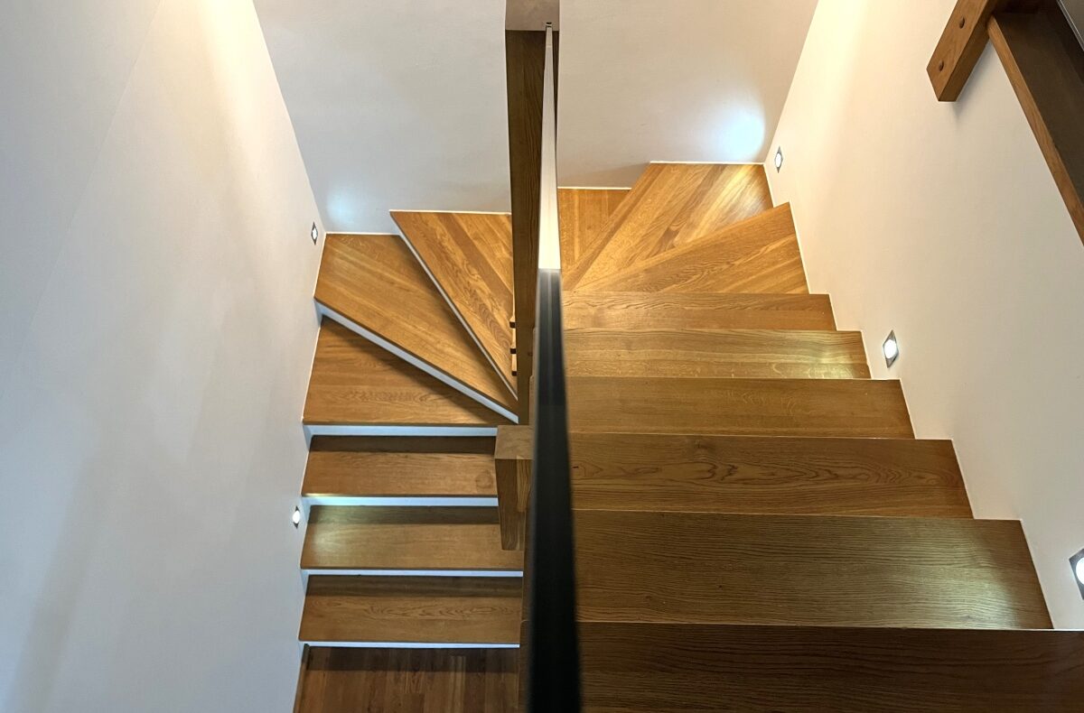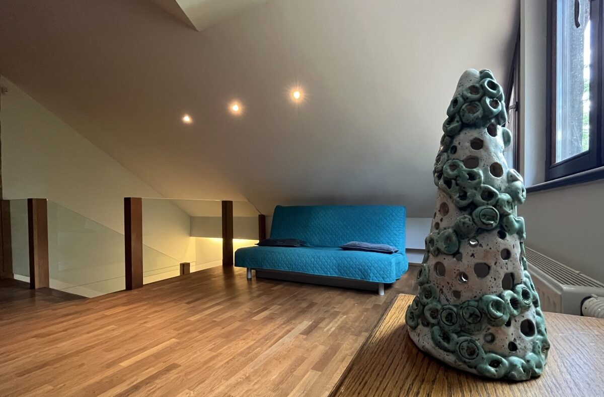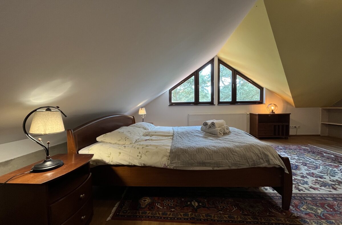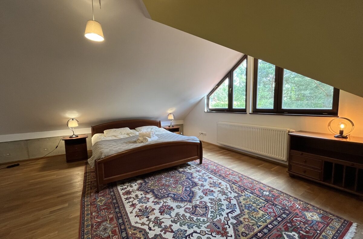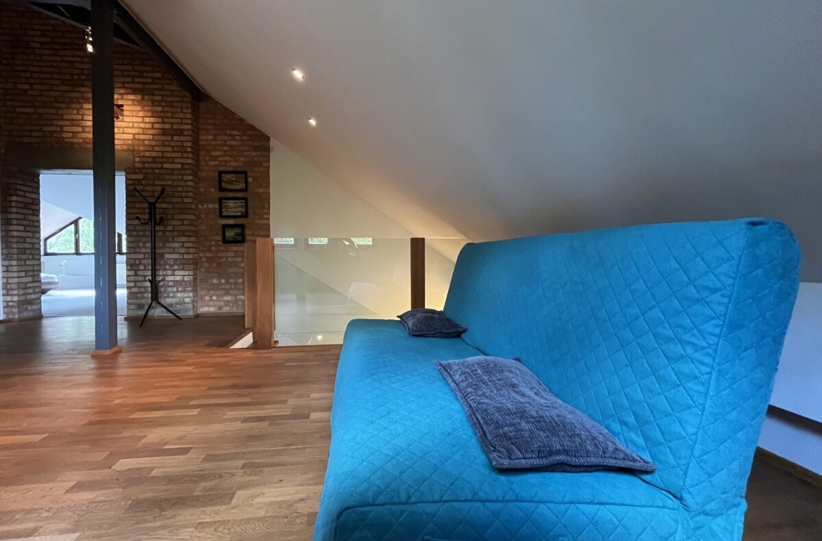 Klasyczne schody prowadzą na górne PIĘTRO z wysokimi pokojami. Tutaj samodzielne dwa pokoje/sypialnie (obie 21 m.kw); open space z kanapą (19,64 m.kw); pokój kąpielowy (duża łazienka z wanną i toaletą) (6,45 m.kw); garderoba z pralnią (5,86 m.kw).