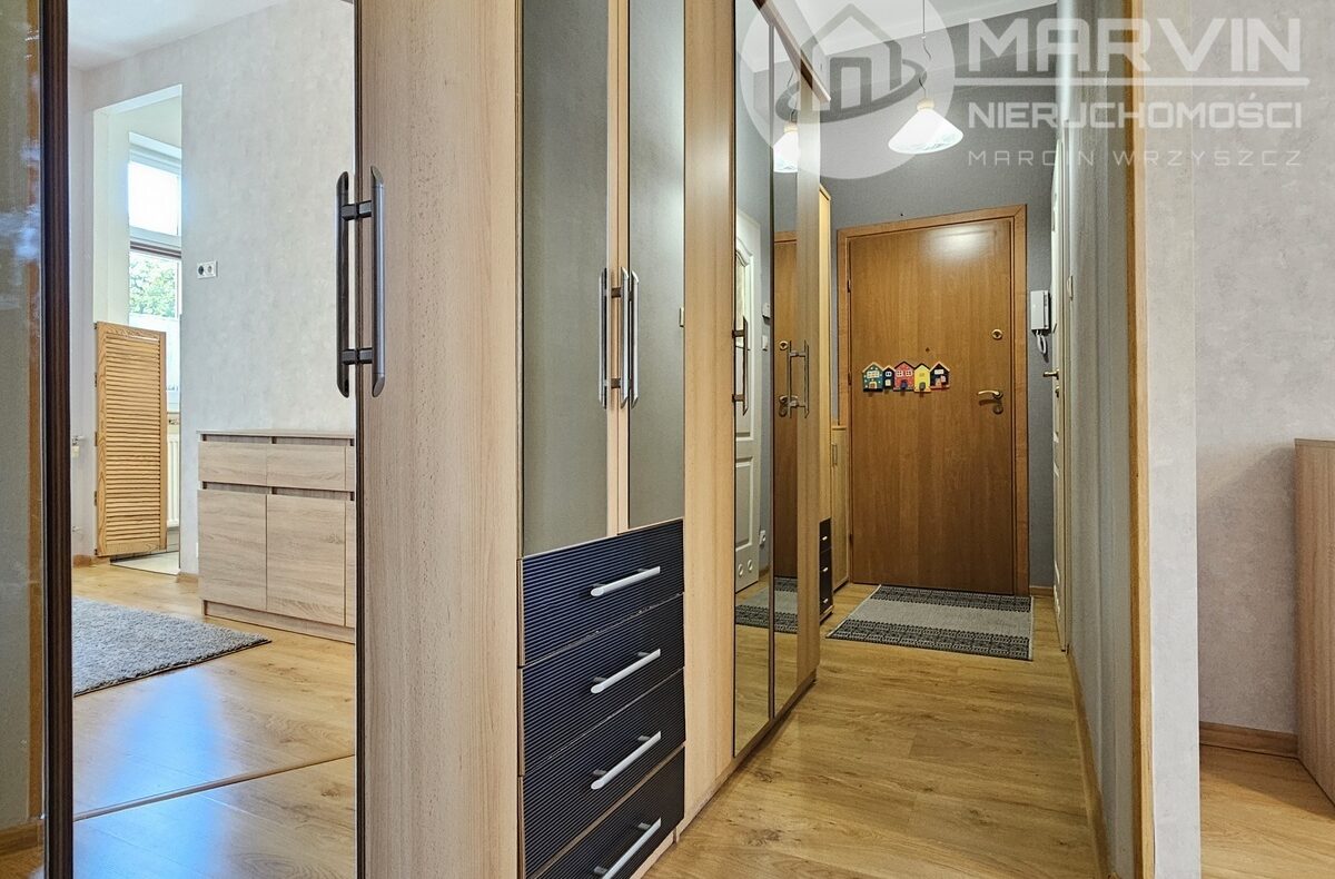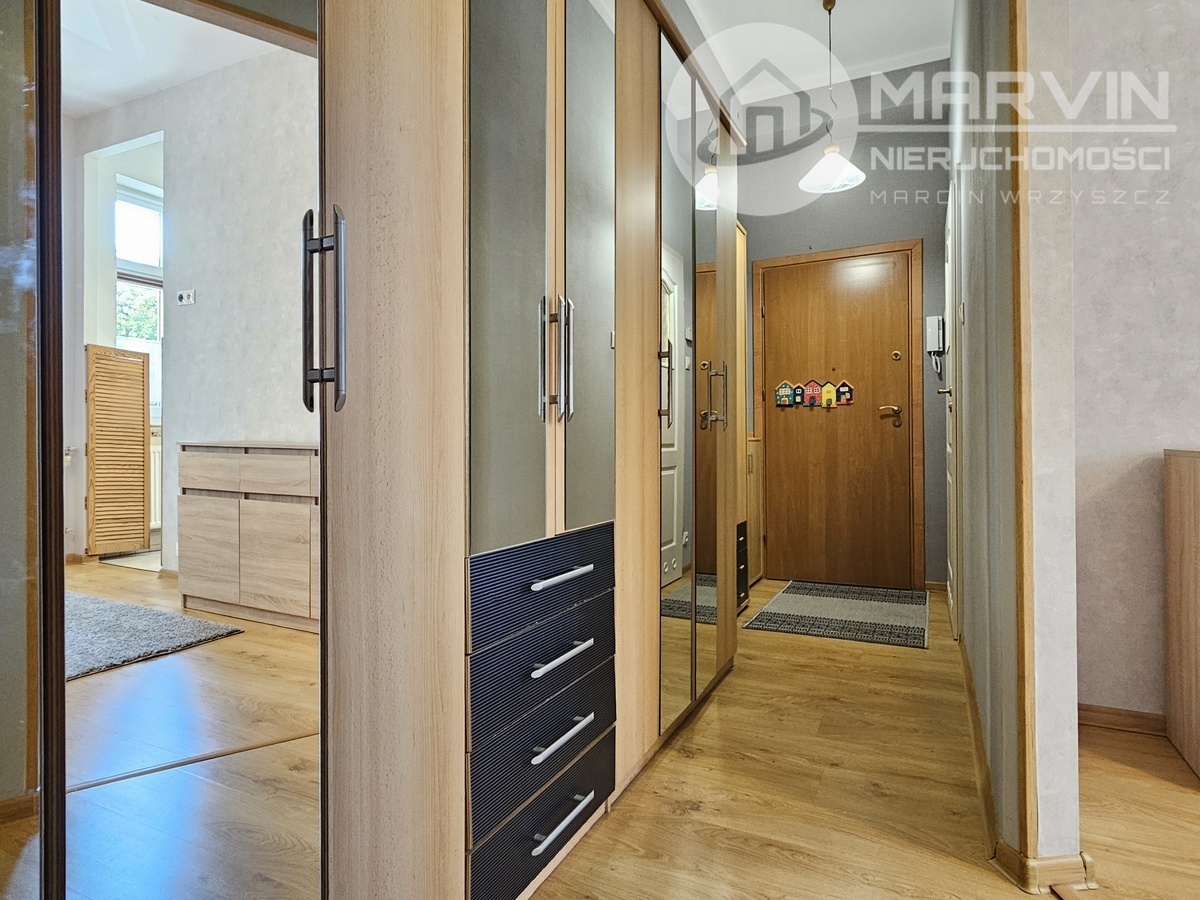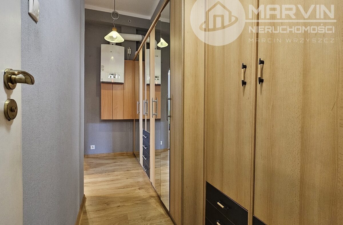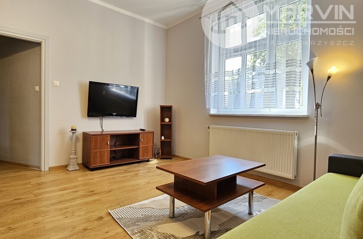Na 44m2 składają się: umeblowany salon, pokój z wejściem do wyposażonej kuchni, wyposażona łazienka i korytarz z wieloma szafami.
