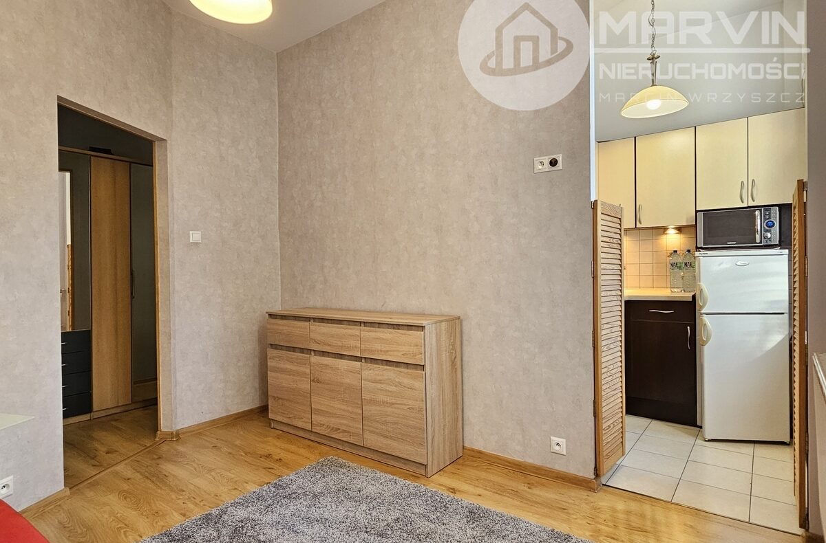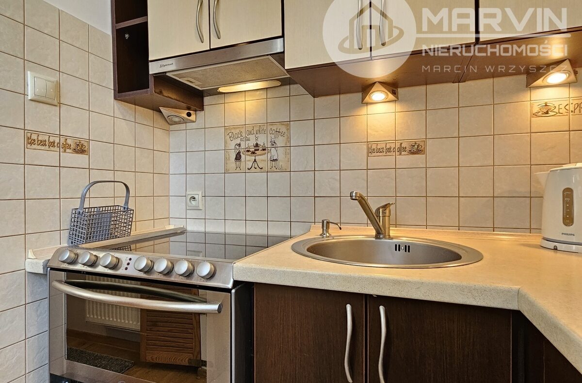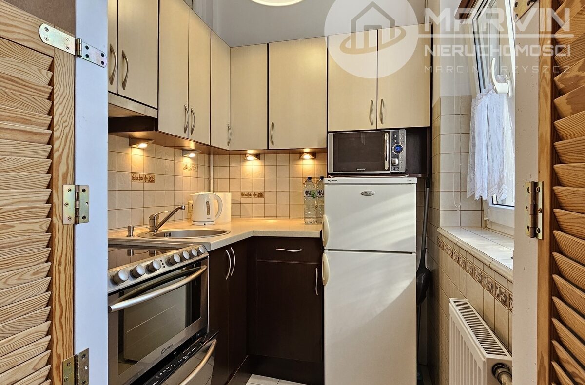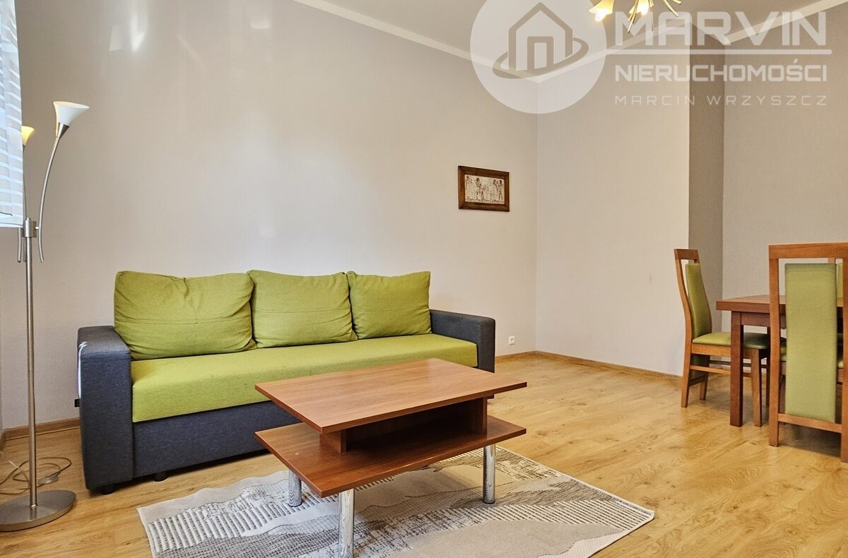 Na 44m2 składają się: umeblowany salon, pokój z wejściem do wyposażonej kuchni, wyposażona łazienka i korytarz z wieloma szafami.