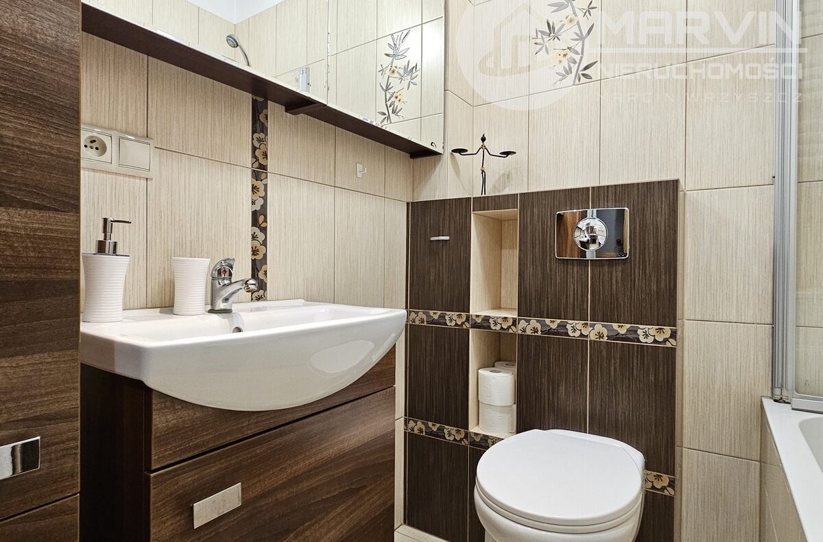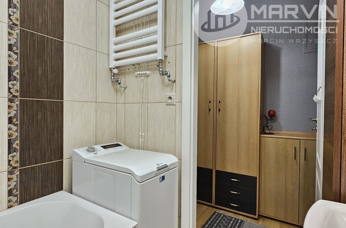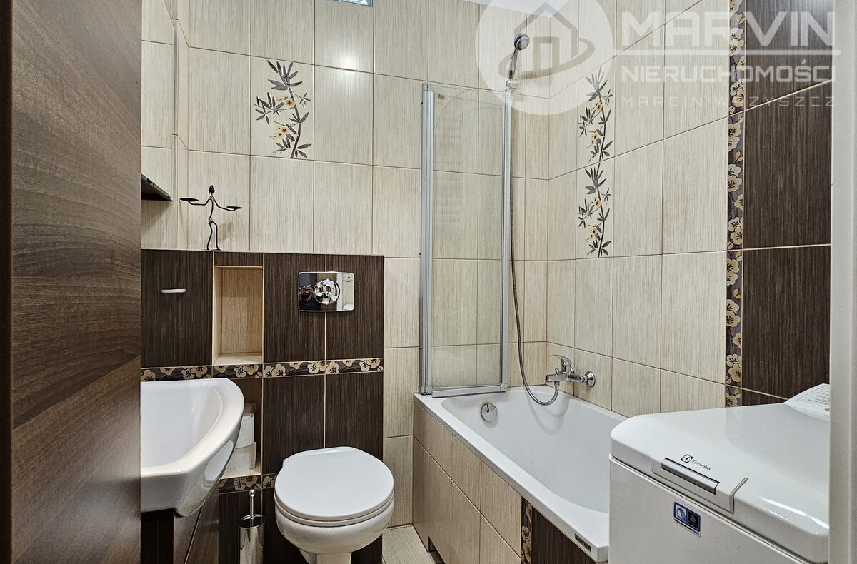 Łazienka – wanna z prysznicem, pralka, szafka z lustrem, zabudowa łazienkowa.
