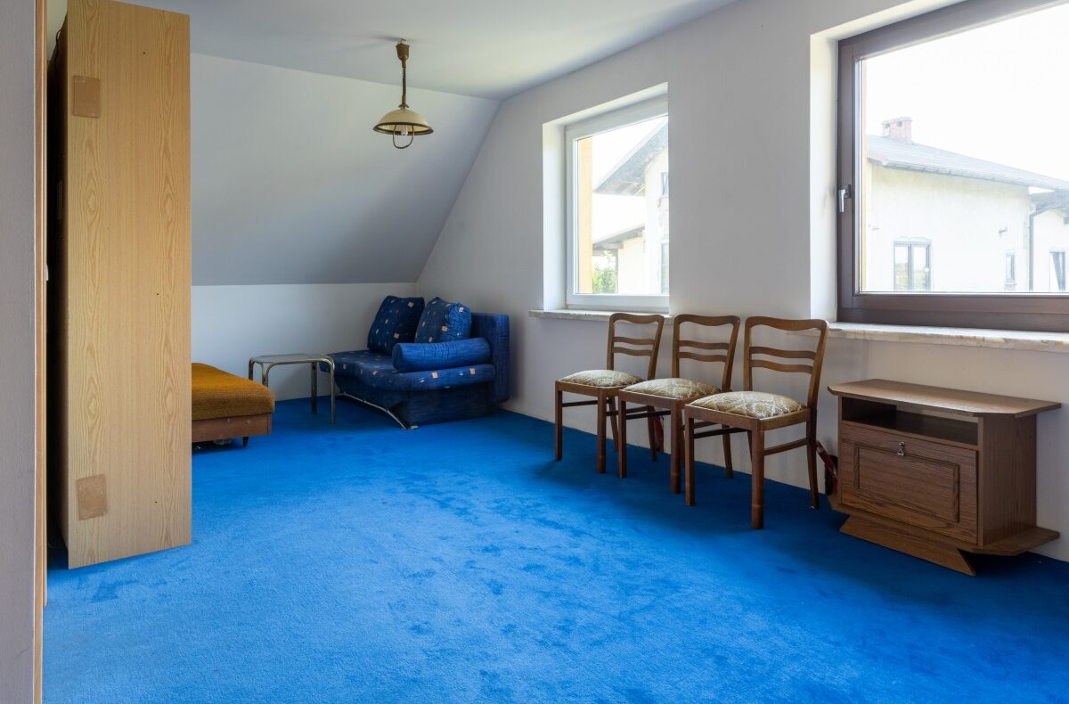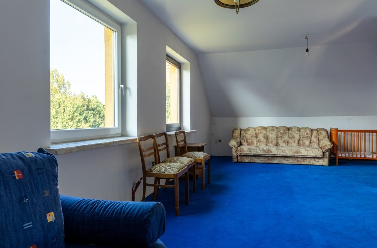 – Poddasze: 1 pokój wykończony, 2 pomieszczenia (łazienka i dodatkowy pokój) do wykończenia, obronione okna i parapety, do tynkowania.