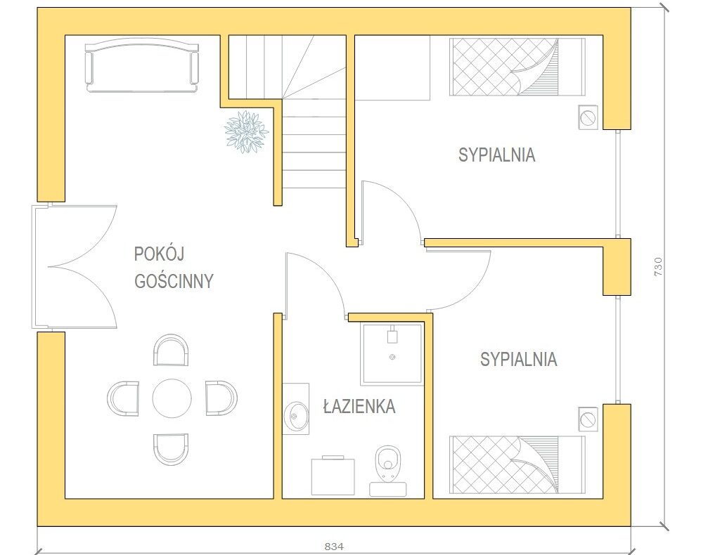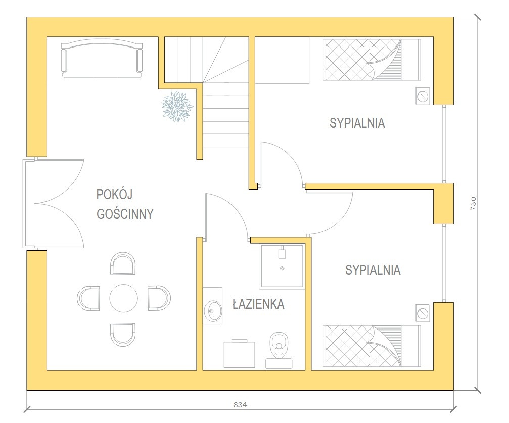 Układ pomieszczeń? Na dole salon. Właściwie salonik, bo to ledwie 31m2 i to z otwartą kuchnią. Oprócz tego łazienka i kotłownia. No ale nie ma sauny.