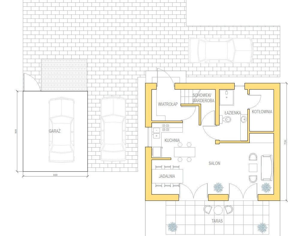 Garaż? Niby jest, 5m x 4m, ale nie wpisany w bryłę budynku. Twojemu autku nie będzie tak ciepło. No a drugie to w ogóle będzie musiało stać pod chmurką.