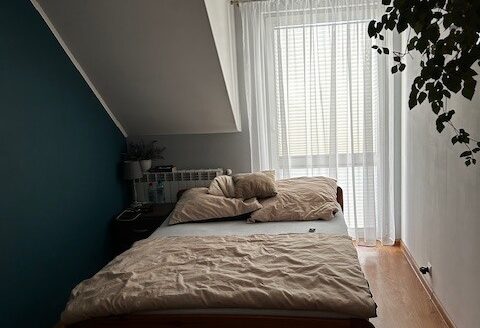 Piętro to 4 sypialnie (każda z oknem do podłogi oraz miejscem na szafę) + duża łazienka (z wanną i prysznicem oraz 2 umywalkami) + wyjście na strych.