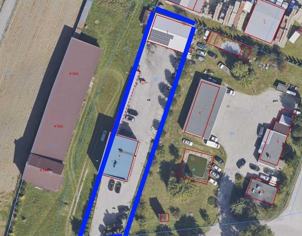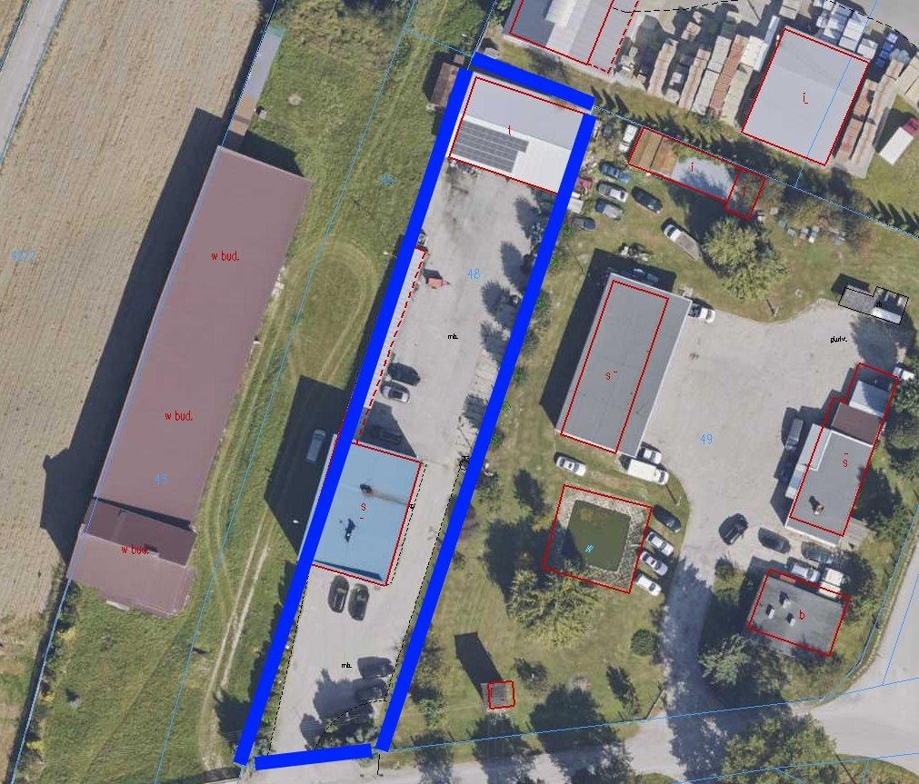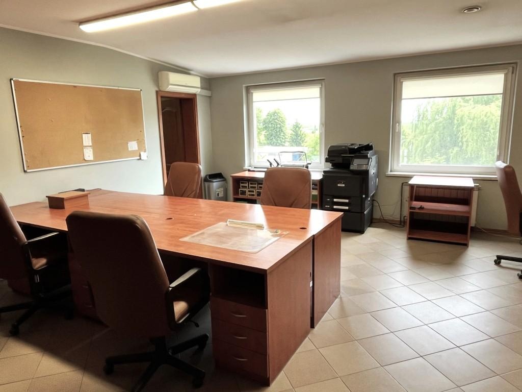 Budynek warsztatowo-biurowy około 450m oraz wiata magazynowa z antresolą około 250m.