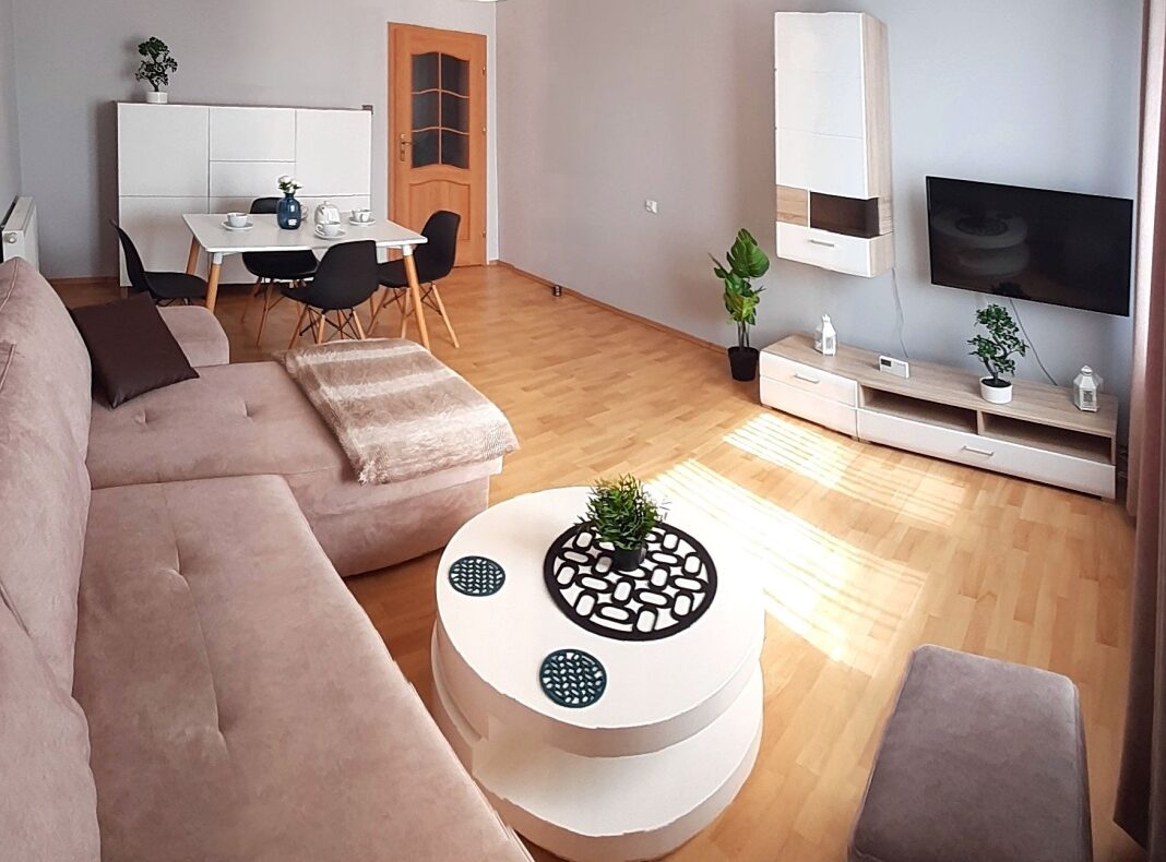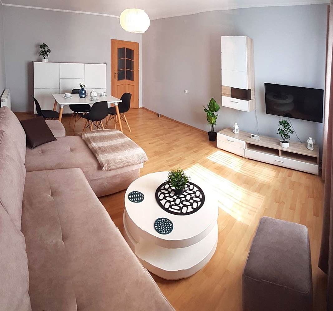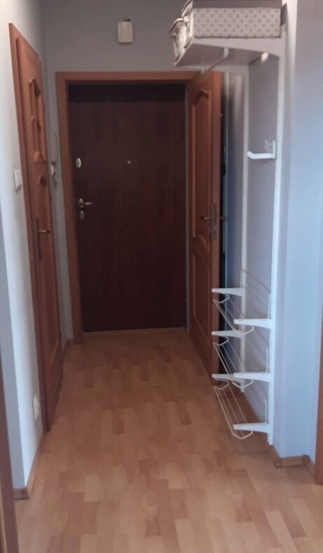 Dużą zaletą mieszkania jest fakt iż ma jeden centralny korytarz z którego jest dostęp do wszystkich pomieszczeń wyposażone w komplet mebli,kuchnia wyposażona w cały sprzęt AGD.