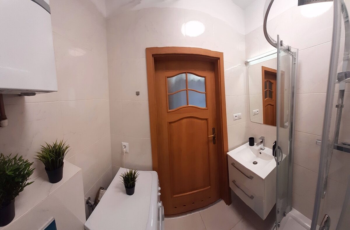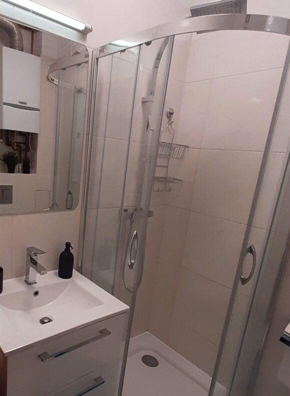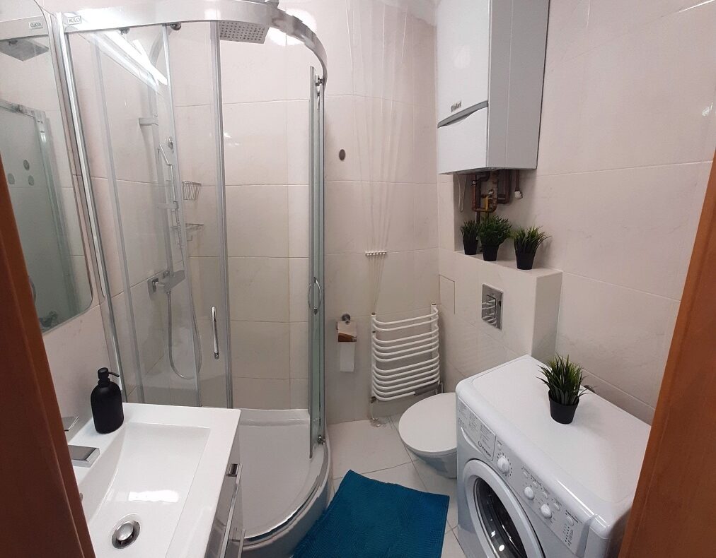 kabina prysznicowa,pralka,umywalka z szafką,lustro,kinkiet łazienkowy,suszarka na pranie,piec gazowy dwu funkcyjny Vaillant
