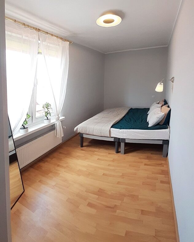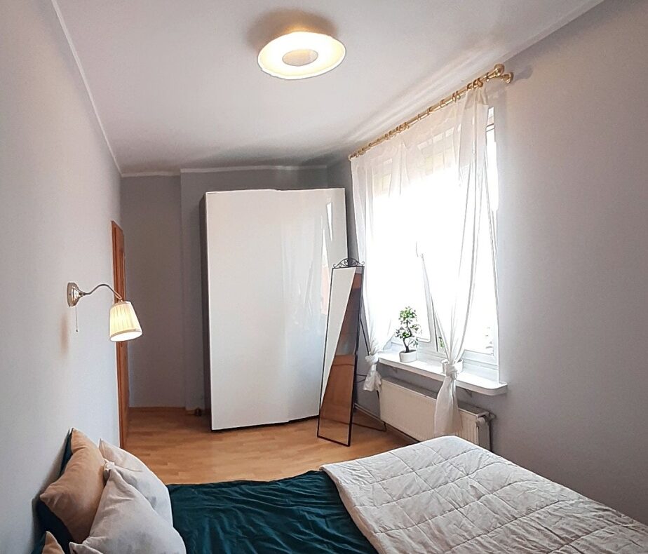 łóżko małżeńskiego 180×200 z materacami IKEA,obszerna szafa na ubrania 150×236,firany i żaluzje w oknie,lustro stojące,lampka ścienna