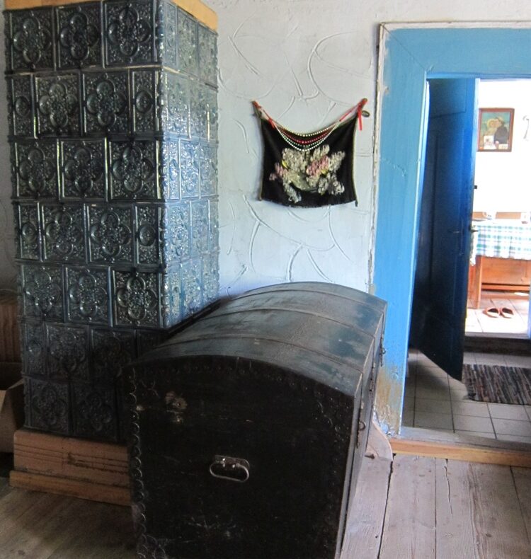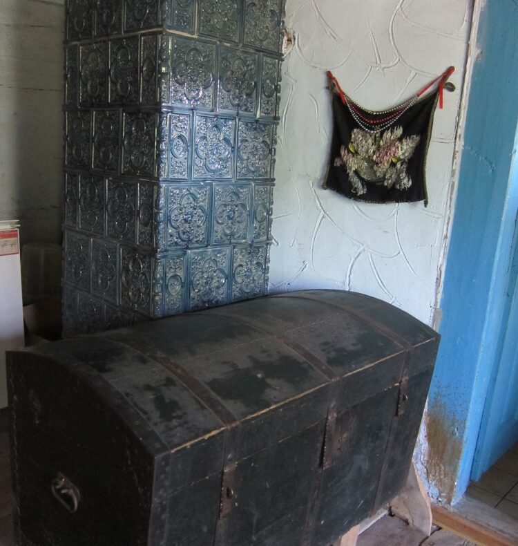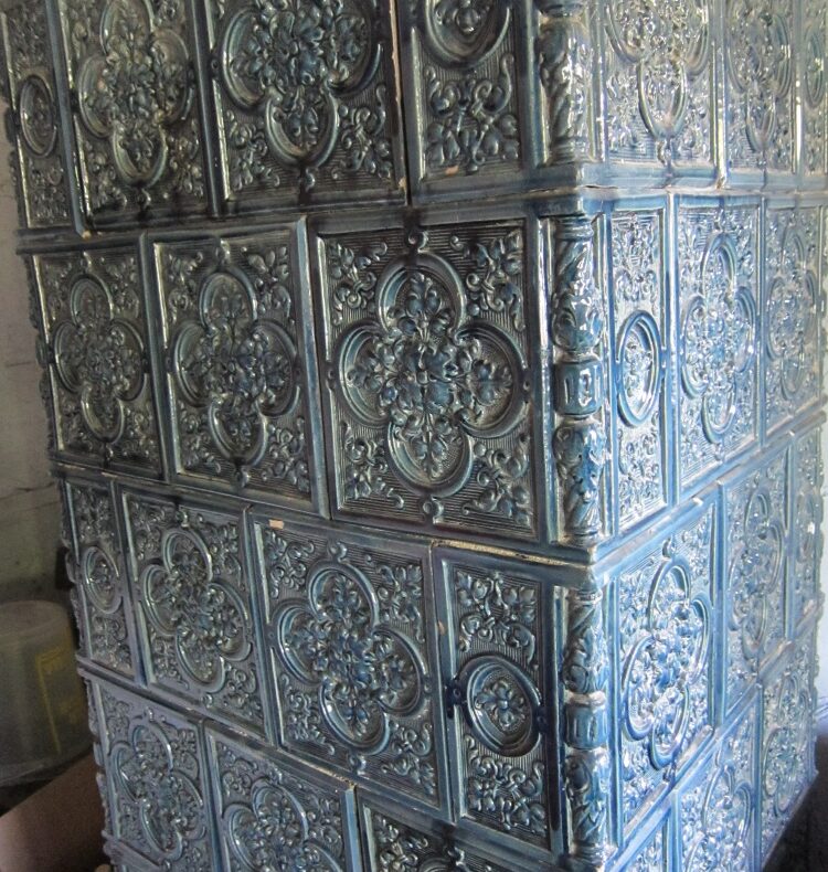 Piece kaflowe: w izbie niebieskie kafle z kamienicy z Krakowa, w kuchni piec kaflowy kuchenny z płytą, piekarnikiem i piecem chlebowym, wszystko sprawne.