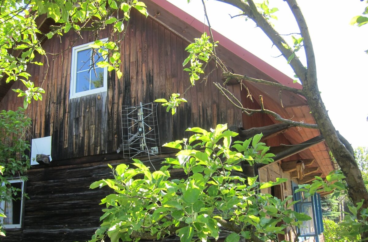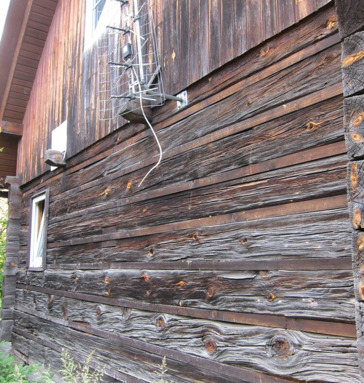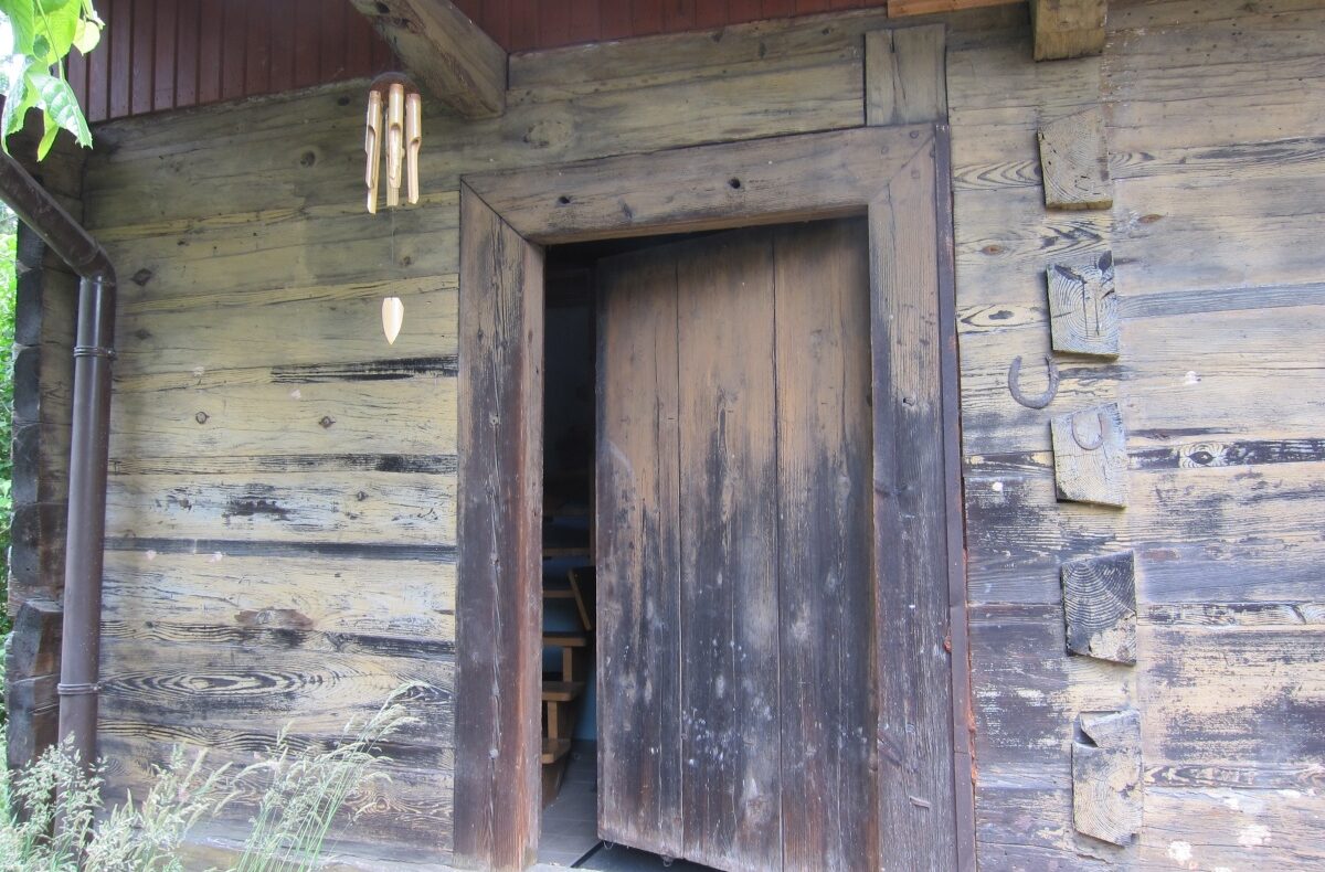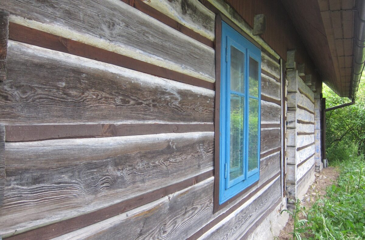 Odnowiona chata wiejska z bali drewnianych z budynkami gospodarczymi, siedlisko