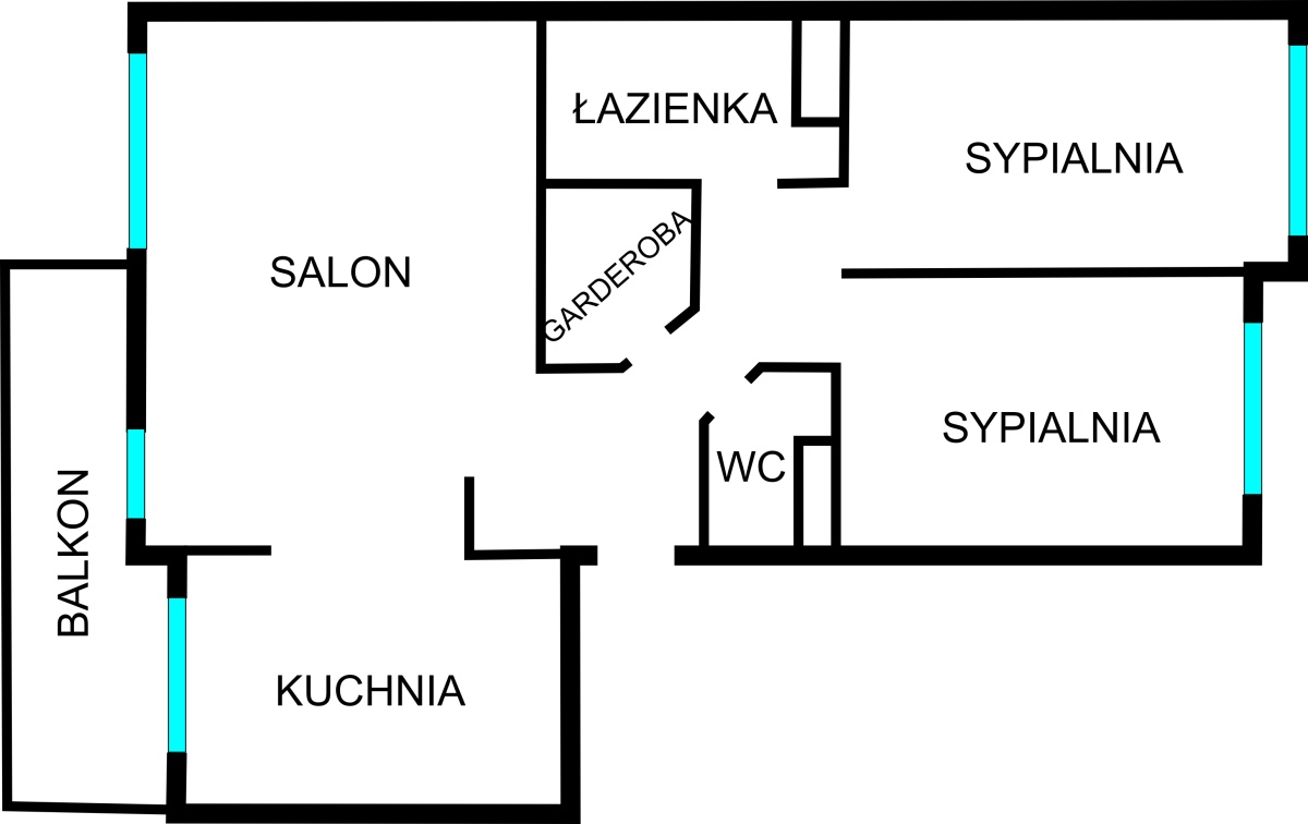 Mieszkanie składa się z dwóch sypialni (12 m2 i 13,5 m2), dużego salonu (23,5 m2) z wyjściem na balkon (10 m2), otwartej na salon widnej kuchni z oknem (8,5 m2), łazienki z wanną (5,5 m2), oddzielnego wc (1,8 m2), garderoby (2,6 m2) oraz przedpokoju.