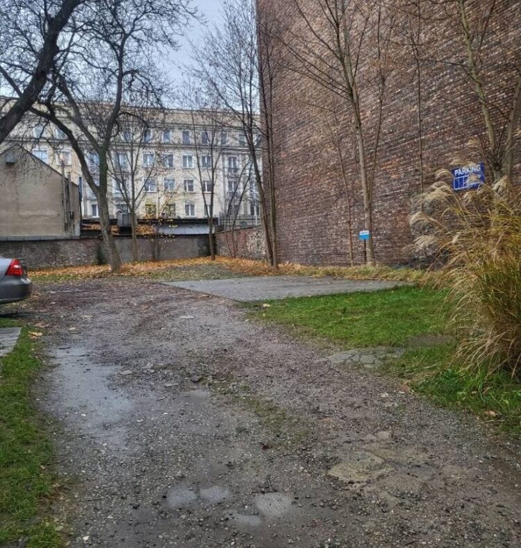 Wjazd od ulicy Śląskiej. W podwórzu miejsca parkingowe.