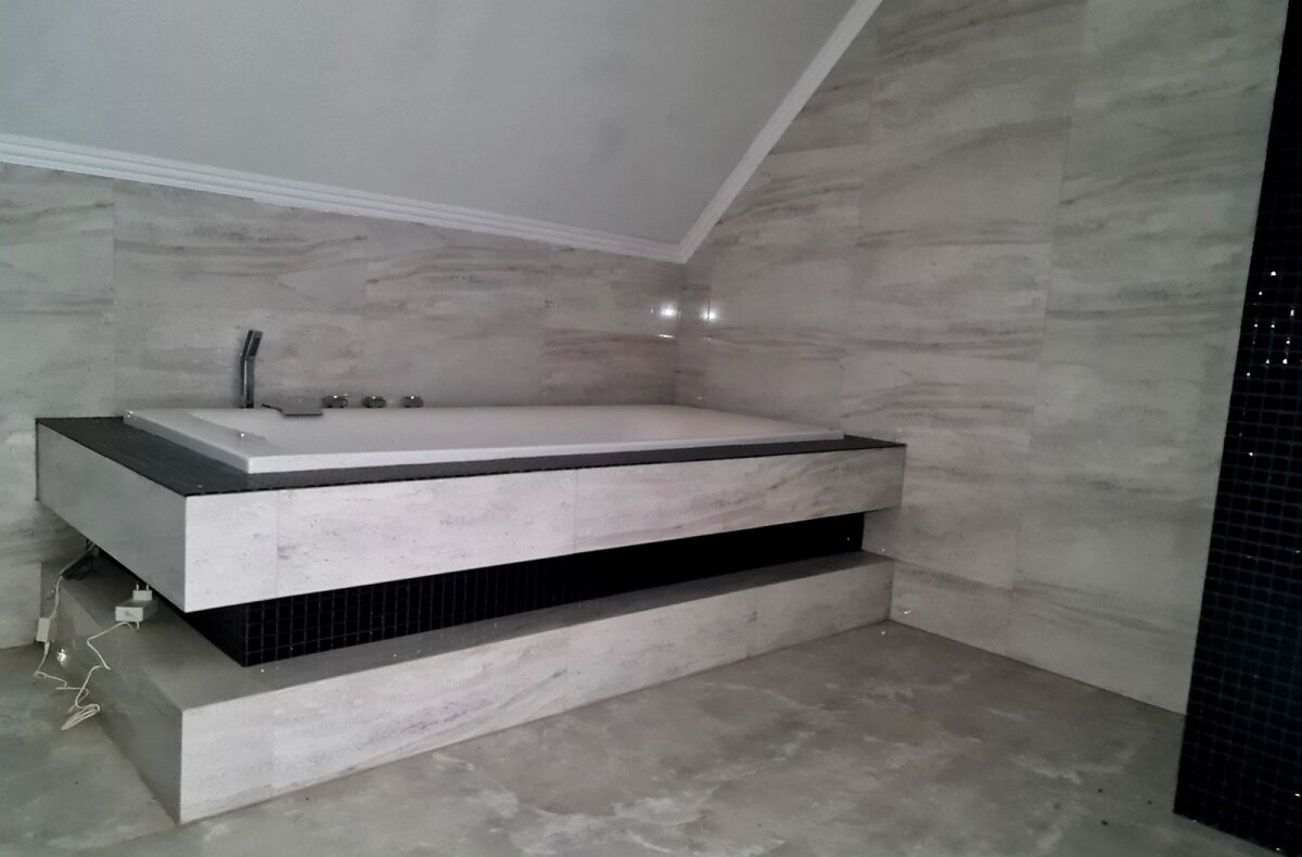 W kotłowni, łazience oraz toalecie na poddaszu zarówno na ścianach, jaki i podłodze położone zostały płytki ceramiczne wysokiej jakości. Również schody prowadzące na poddasze obłożono płytkami ceramicznymi, ponadto ściana przy schodach ozdobiona została tynkiem dekoracyjnym wpisującym się w nowoczesne trendy.
