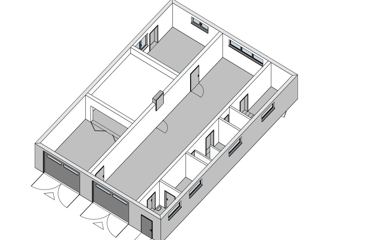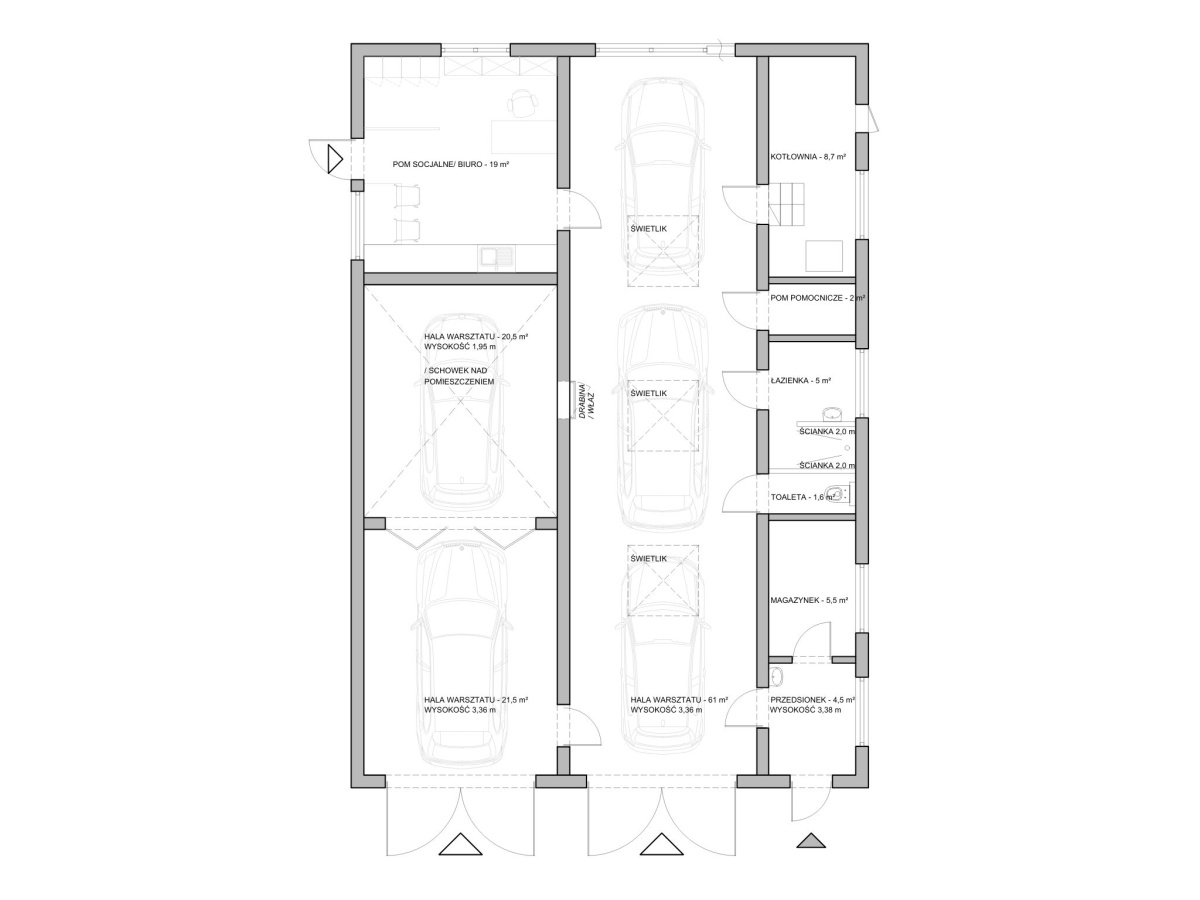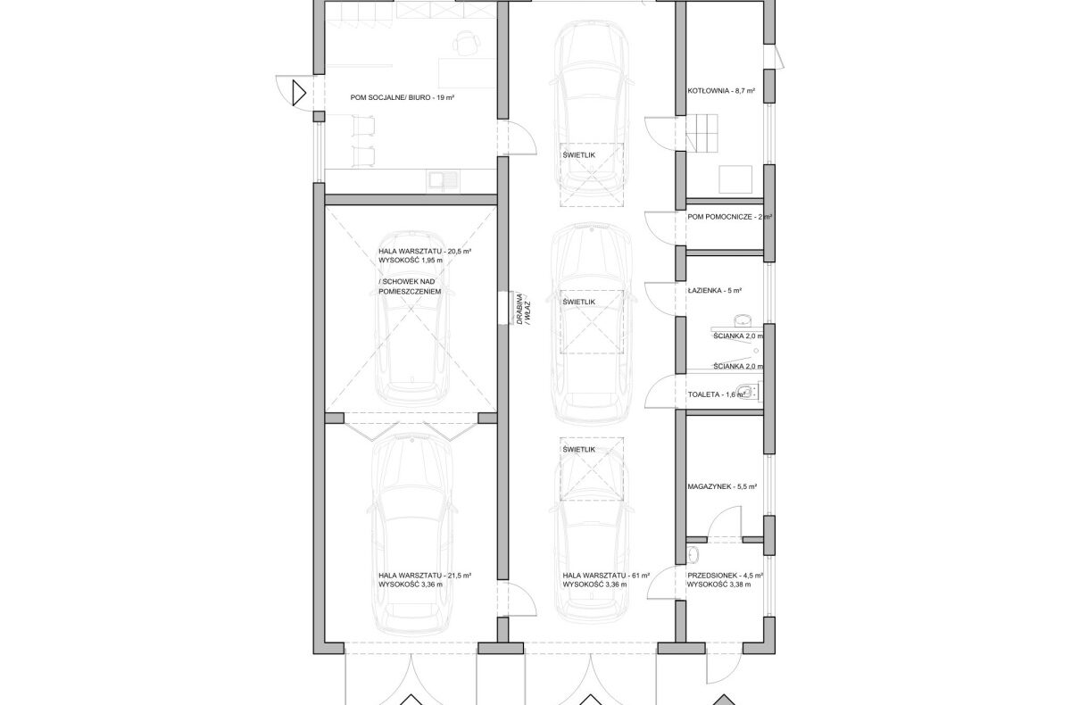 • 2 odrębne hale warsztatowe – max 5 samochodów osobowych, wysokość pom. 3,36 m, powierzchnia hal to 103 m²