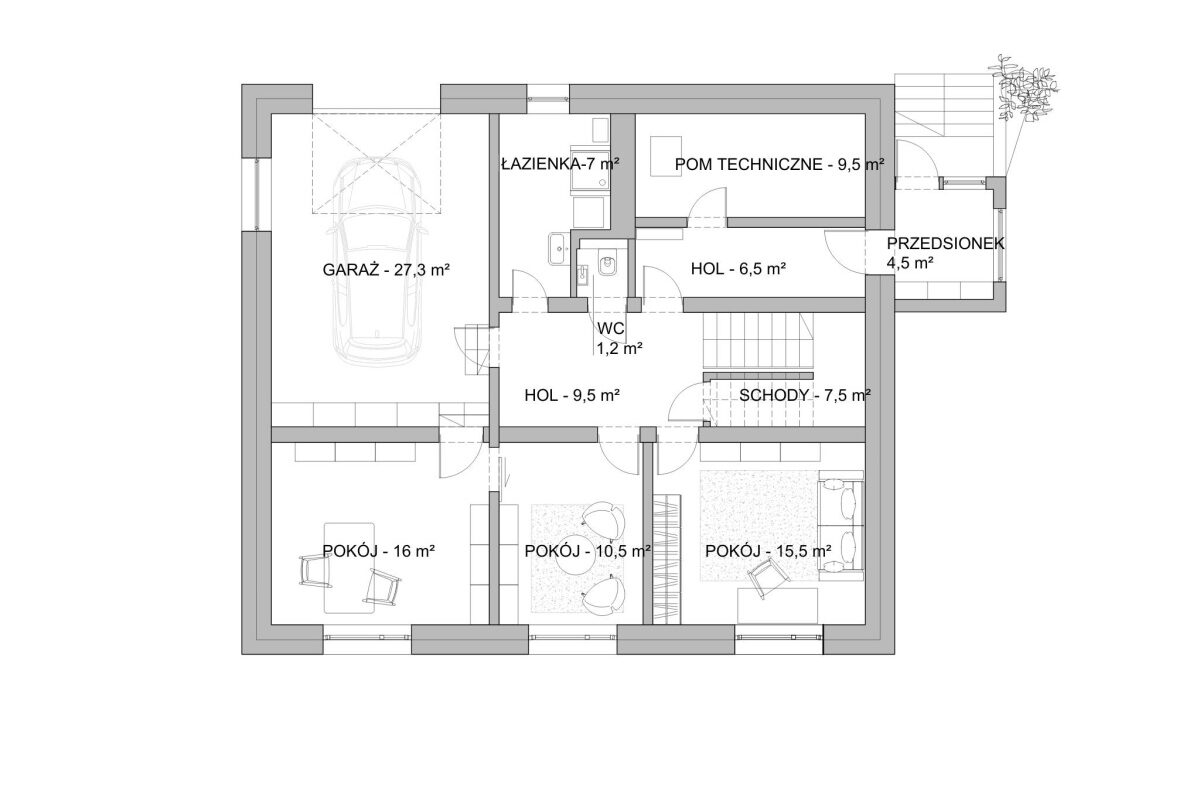 • Wbudowany garaż – 27,5 m2 z uchylną bramą na pilota, z oknem