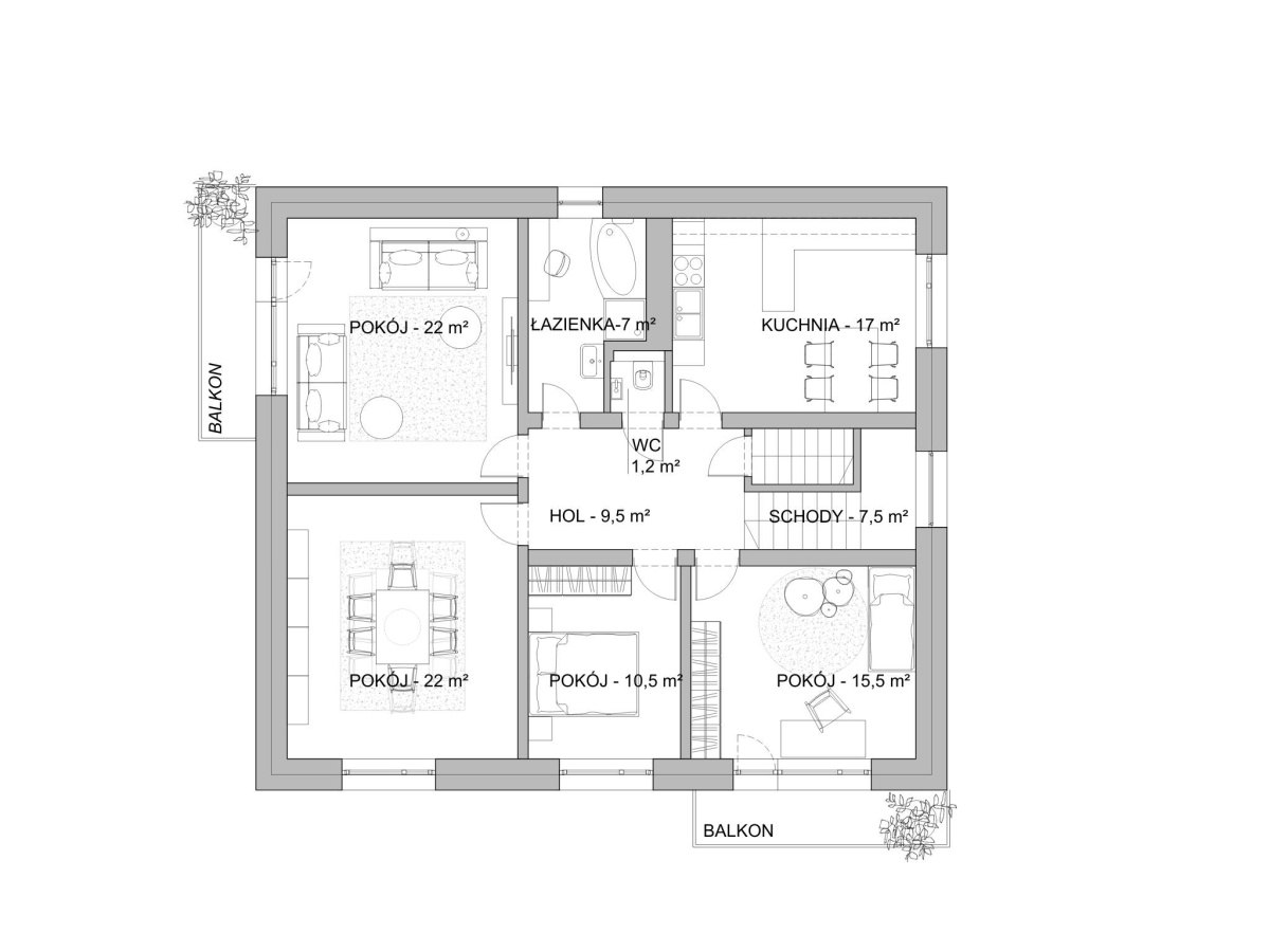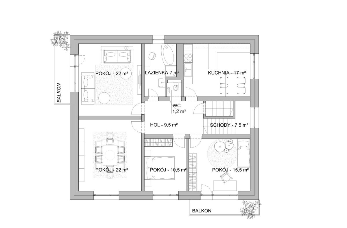 • 7 niezależnych pokoi – 3 na parterze, 4 na piętrze, okna na poł. i zach., dwa balkony