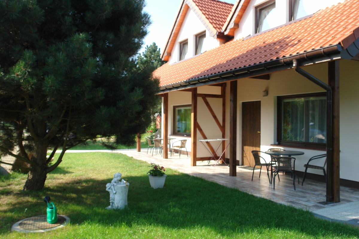 Wejście do domu z obu stron budynku z zadaszonego tarasu o pow. około 24 m2