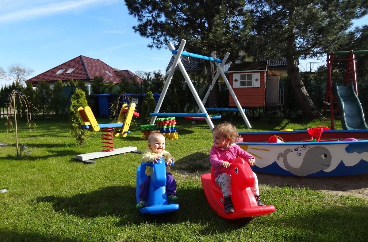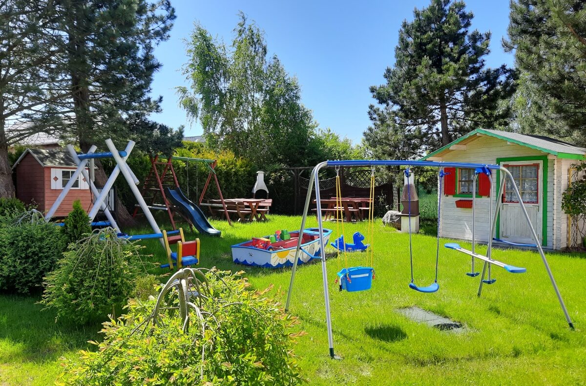 Plac zabaw dla dzieci wyposażony w zjeżdżalnię, huśtawki, drewniany domek, bujaki, piaskownicę z zabawkami.