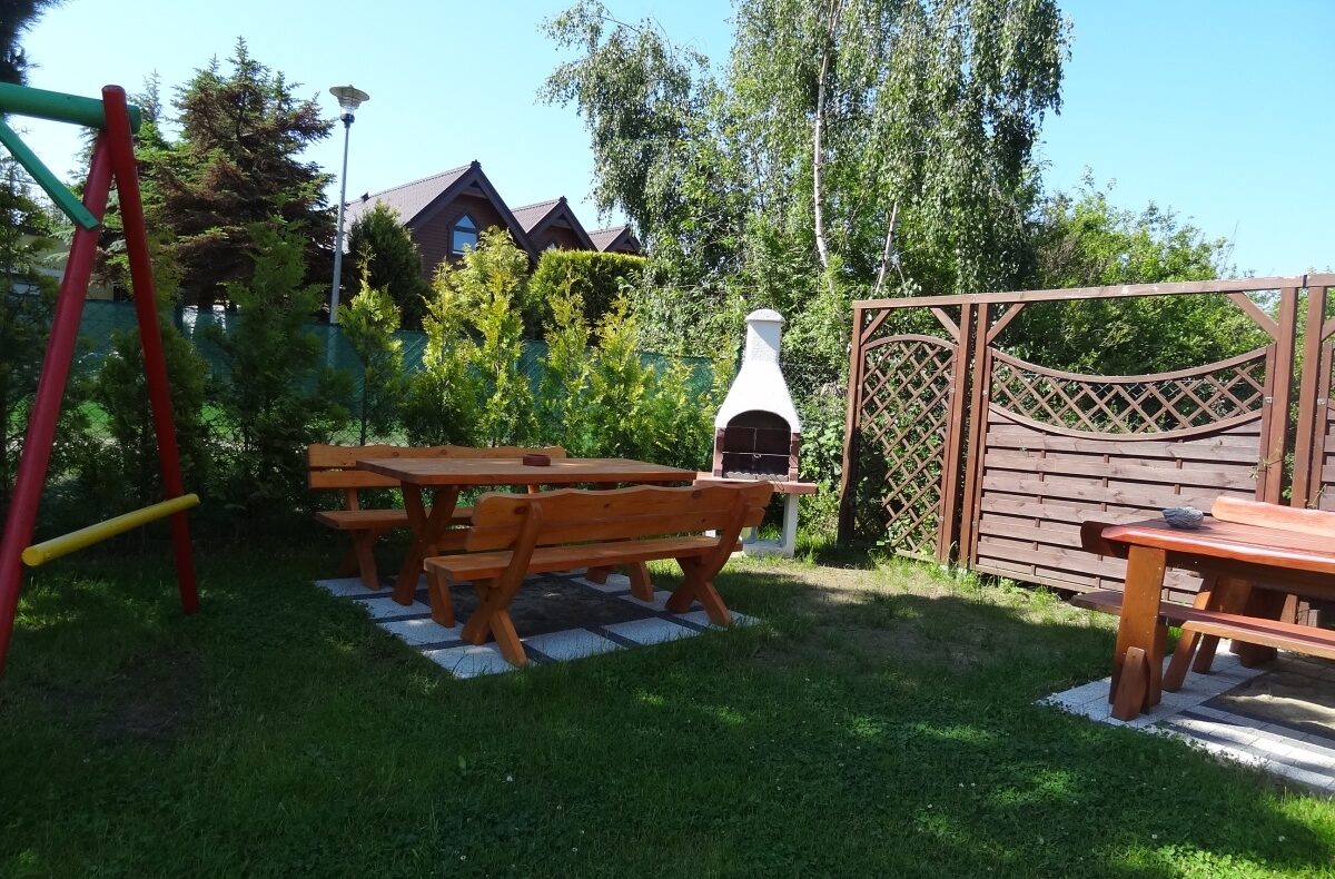 Na ogrodzie 2 murowane grille oraz 2 stoły drewniane z ławkami.