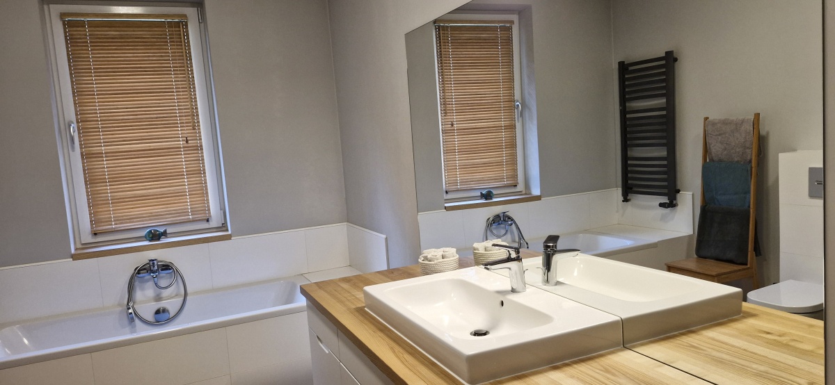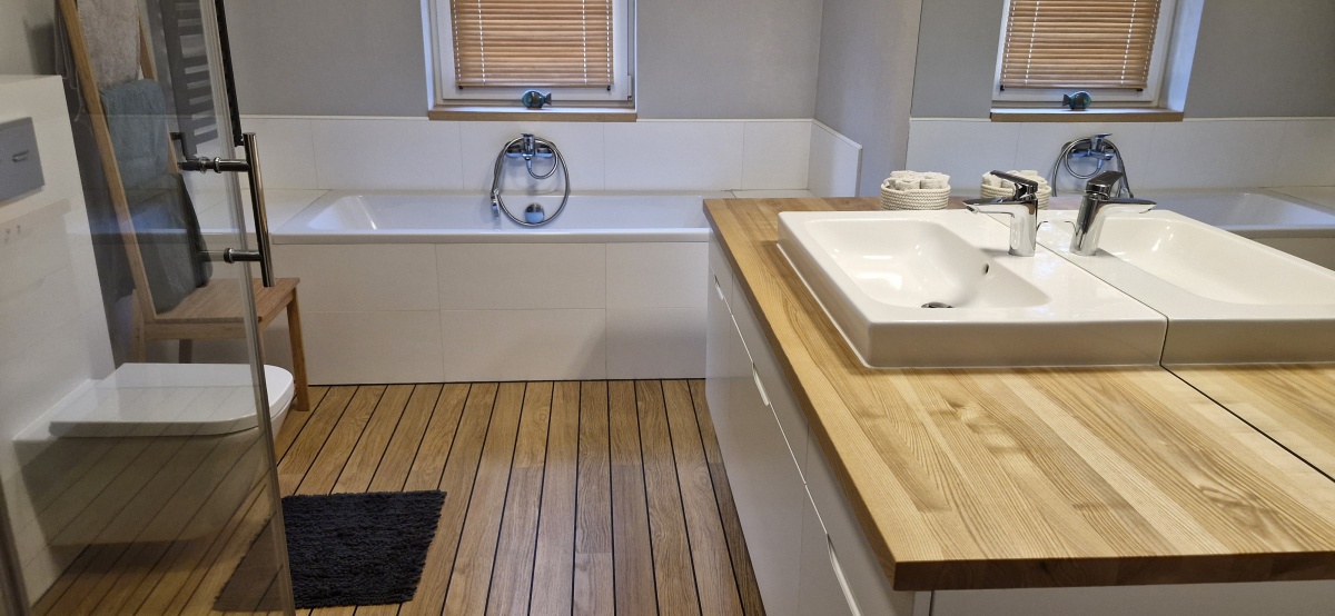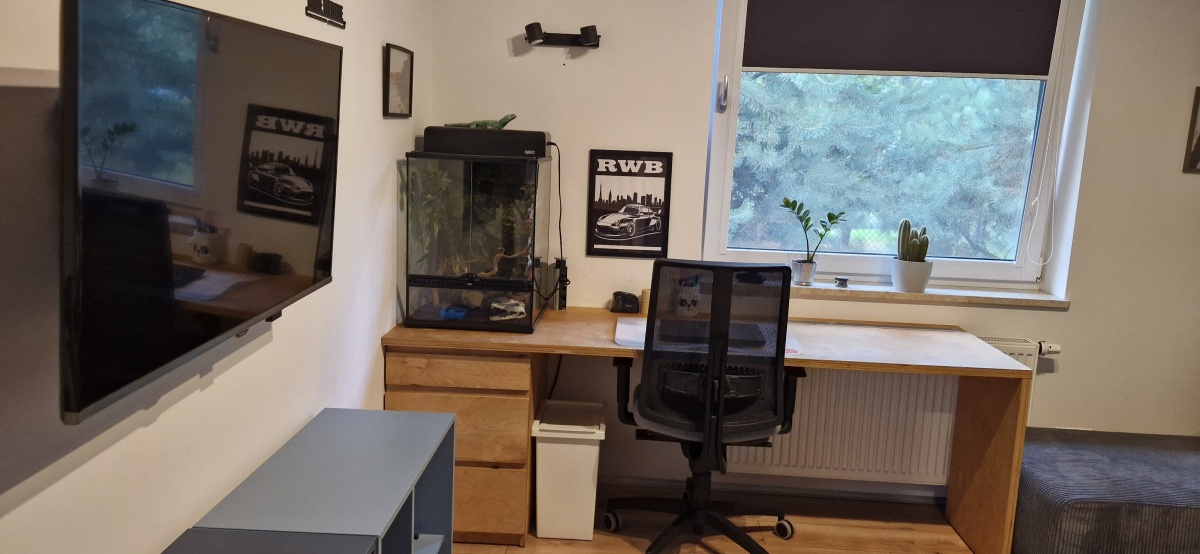 Przedpokój 6.40 mkw. z funkcjonalną i pojemną szafą wnękową . Łazienka z oknem 9 mkw. umywalka , kabina prysznicowa i duża wanna . Jest też osobne WC gdzie podłączona jest pralka .