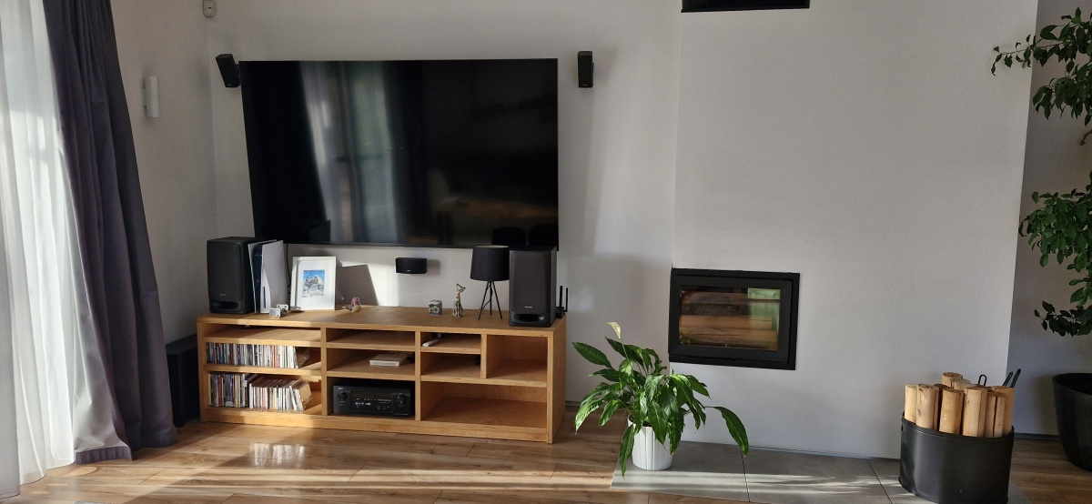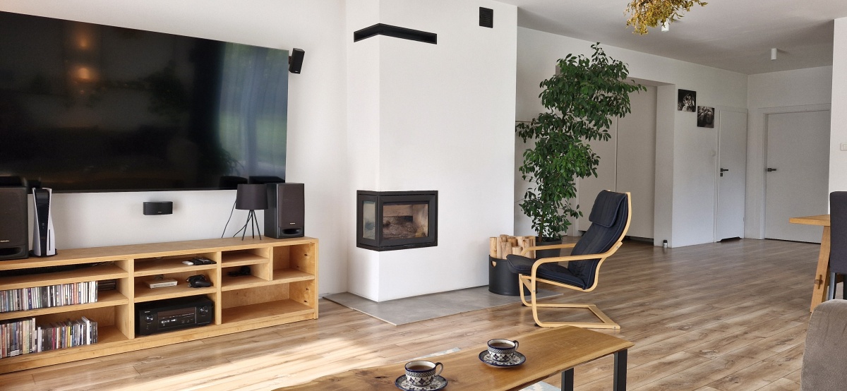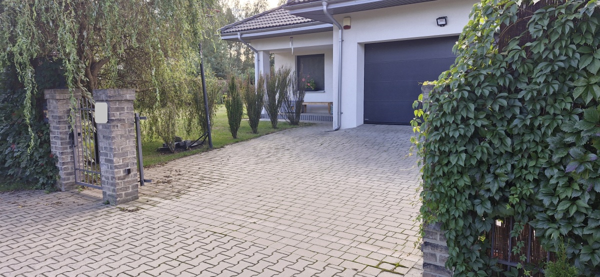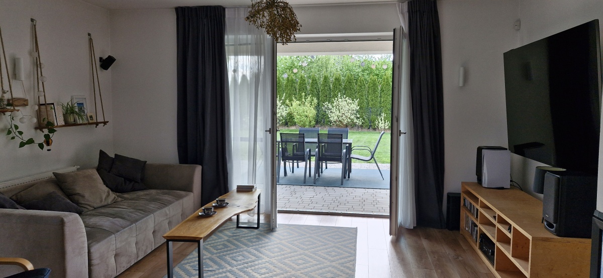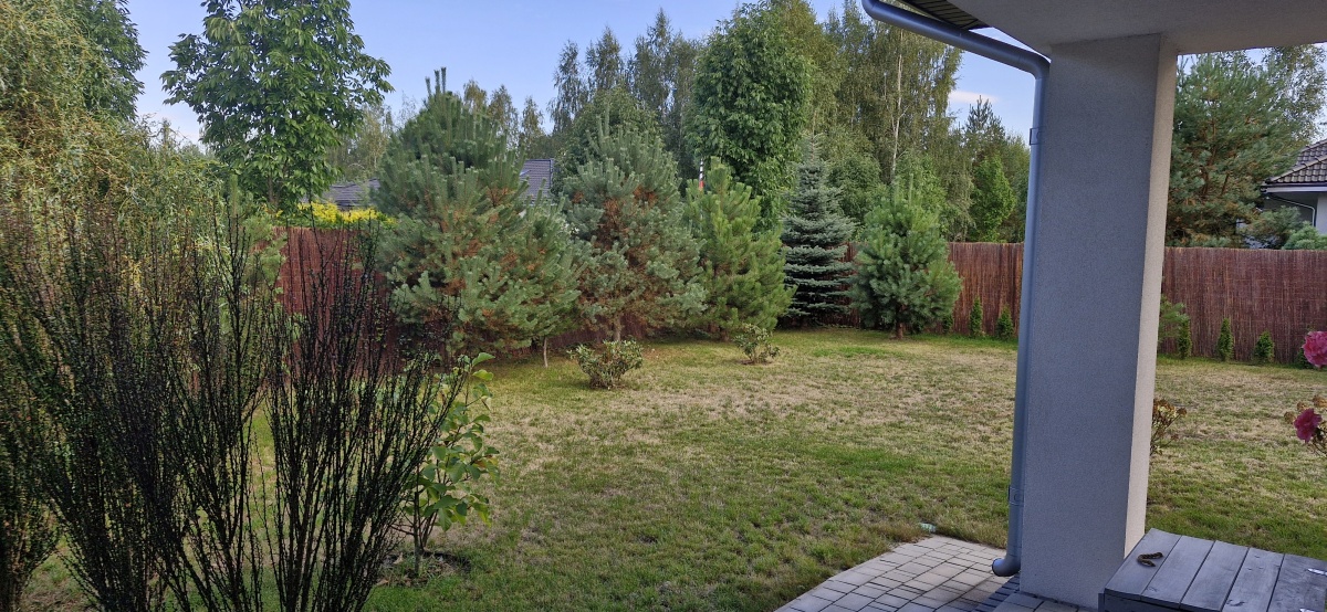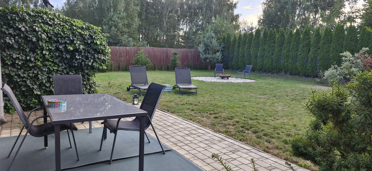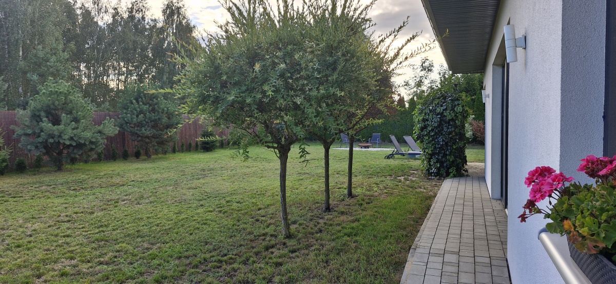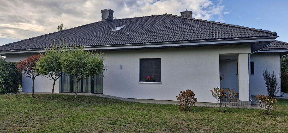 Dom jednorodzinny 3 sypialnie odpowiednio 18.80 z szafą wnękową , 13.20, 9.30 mkw. Salon 38 mkw. z kominkiem, duże przeszklenia z dwóch stron i wyjście na płaski taras oraz zadbany ogród .
