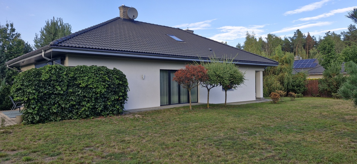 Dom parterowy o powierzchni całkowitej 165 mkw. użytkowej 135 mkw. Dom wybudowany w 2018 r z bloczków ceramicznych , dach dachówka ceramiczna , ogrzewany gazem piec Junkers , woda z ujęcia gminnego , własne szambo . Wysokość pomieszczeń 270 cm.