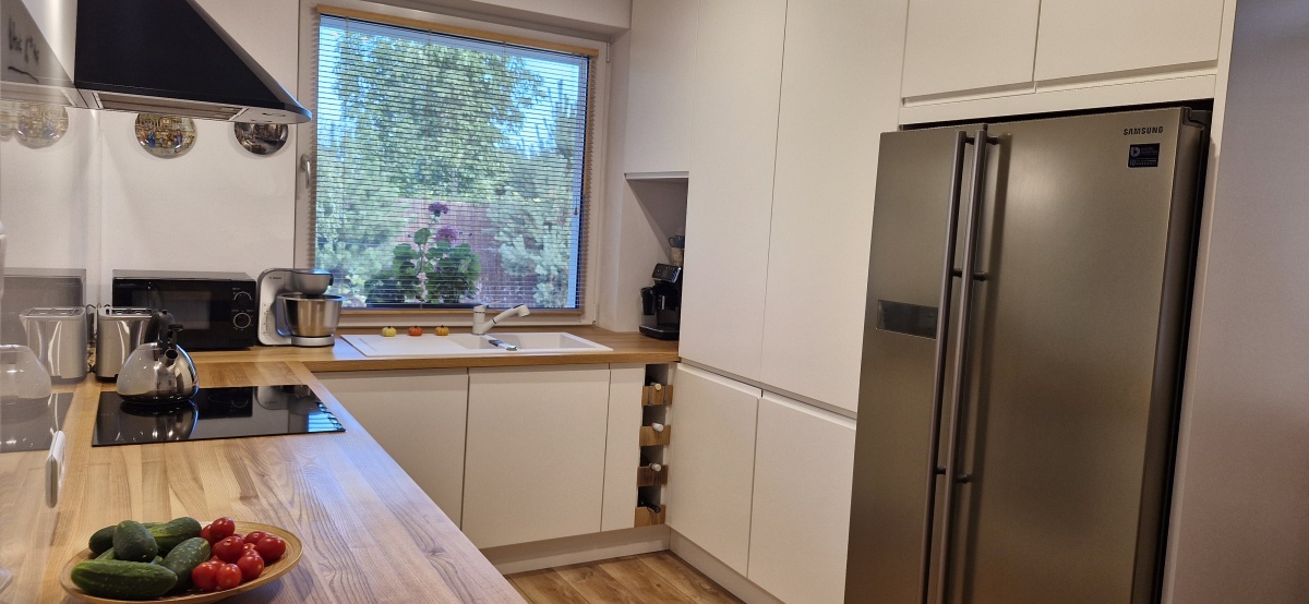 Kuchnia nie połączona z salonem 13 mkw. obok kuchni niewielka 2.5 mkw. spiżarnia .Kuchnia w pełni wyposażona sprzęt AGD i zabudowa .