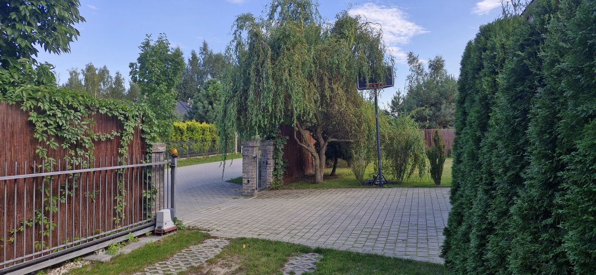 Duża foremna działka wymiary orientacyjne 45 x 31 m z nasadzeniami tuje , winobluszcz i inne . Nieruchomość ogrodzona , od frontu metalowe kute pozostała ogrodzenie to siatka .
