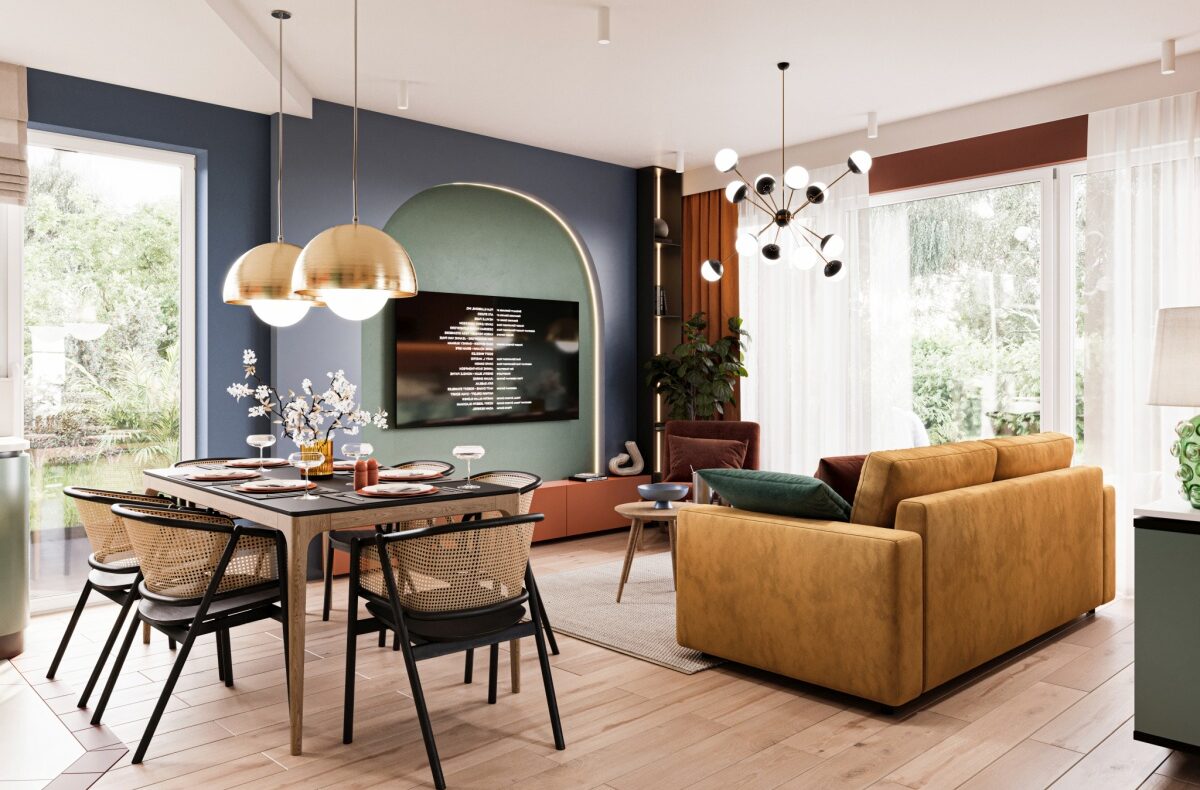 -duże przeszklenia otwierające salon na ogród,