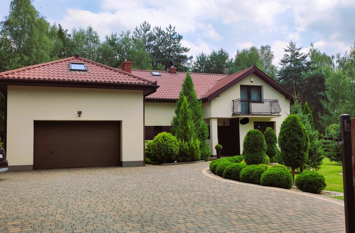 Technologia: Budowany z pustaków POROTHERM 42 cm, ocieplony, z wykończoną elewacją zewnętrzną i dachem z blachodachówki.