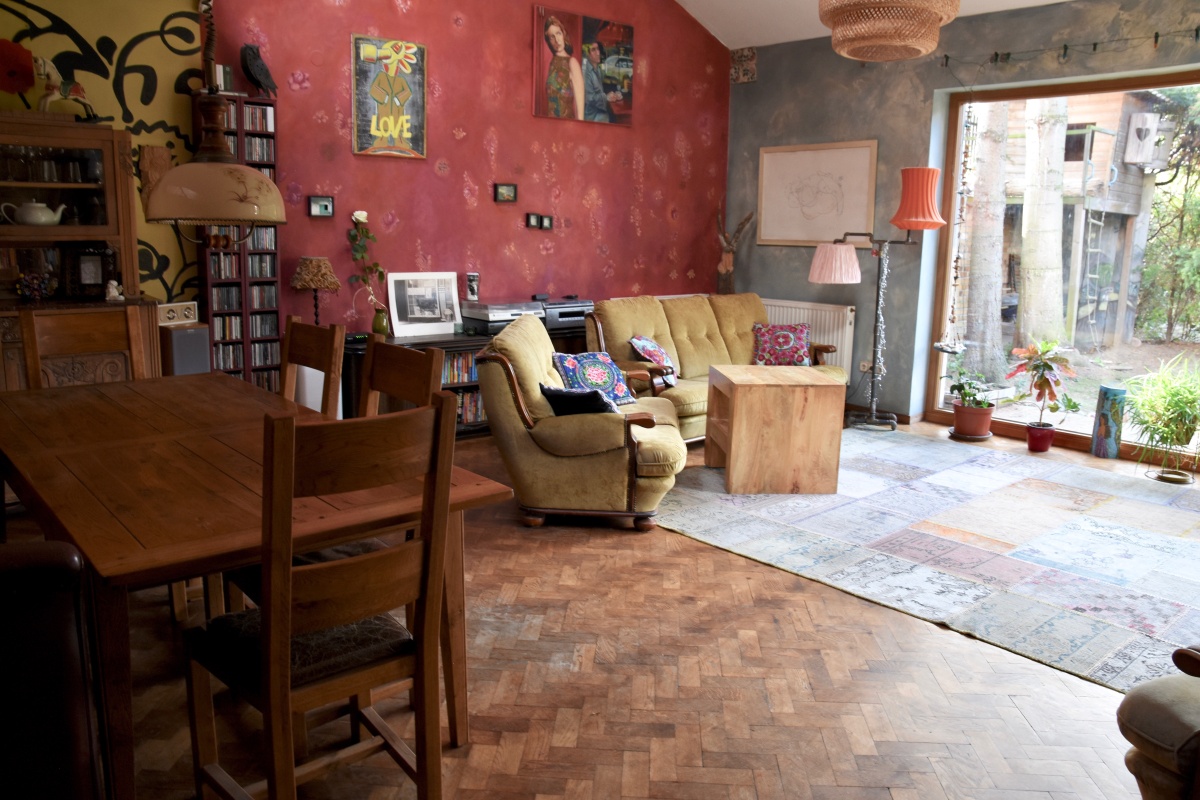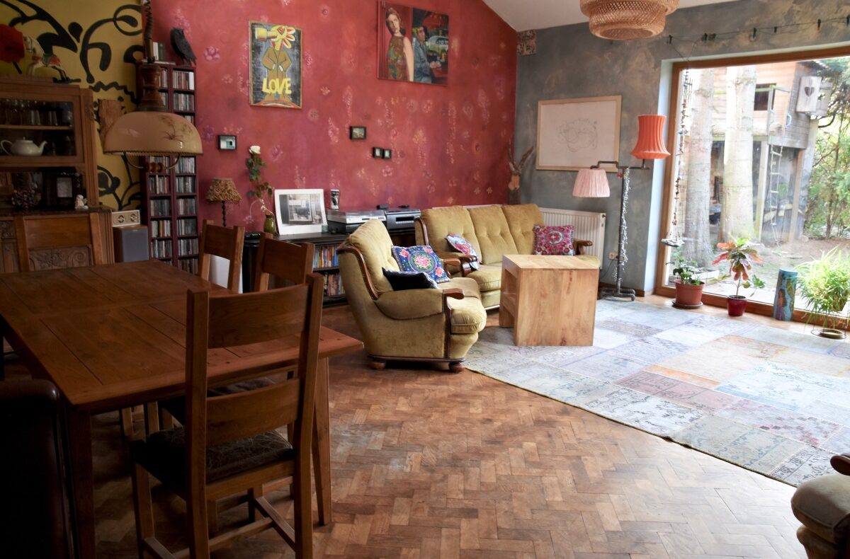 *przestronny salon z z otwartą kuchnią i wyjściem na taras i ogród wewnętrzny 57,5m²